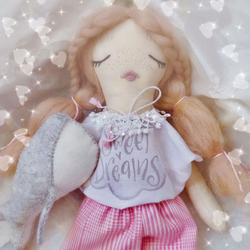 Сплюшка является неотъемлемой частью для сна с ребенком. Куколка из натуральных материалов, мягкая нежная имеет свою постель, которая сворачивается и можно брать с собой в дорогу, а также имеет фетровую игрушку кита (сшитого вручную)