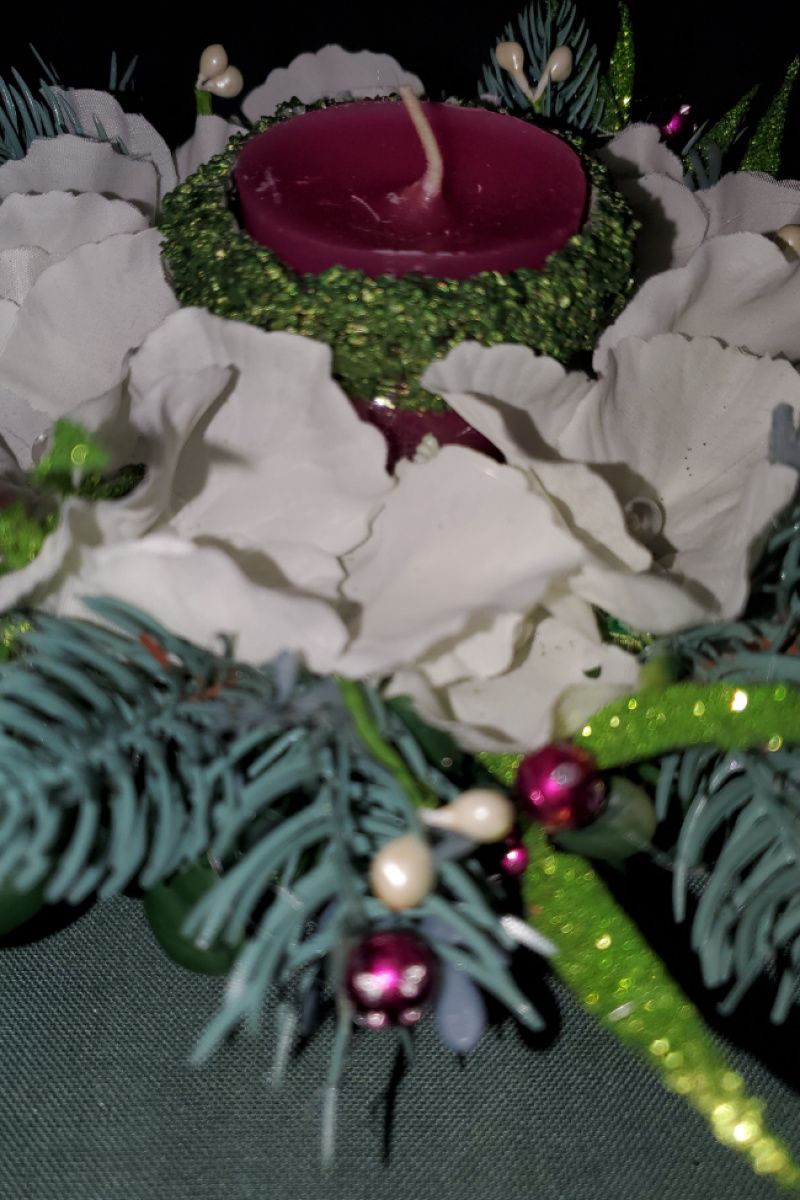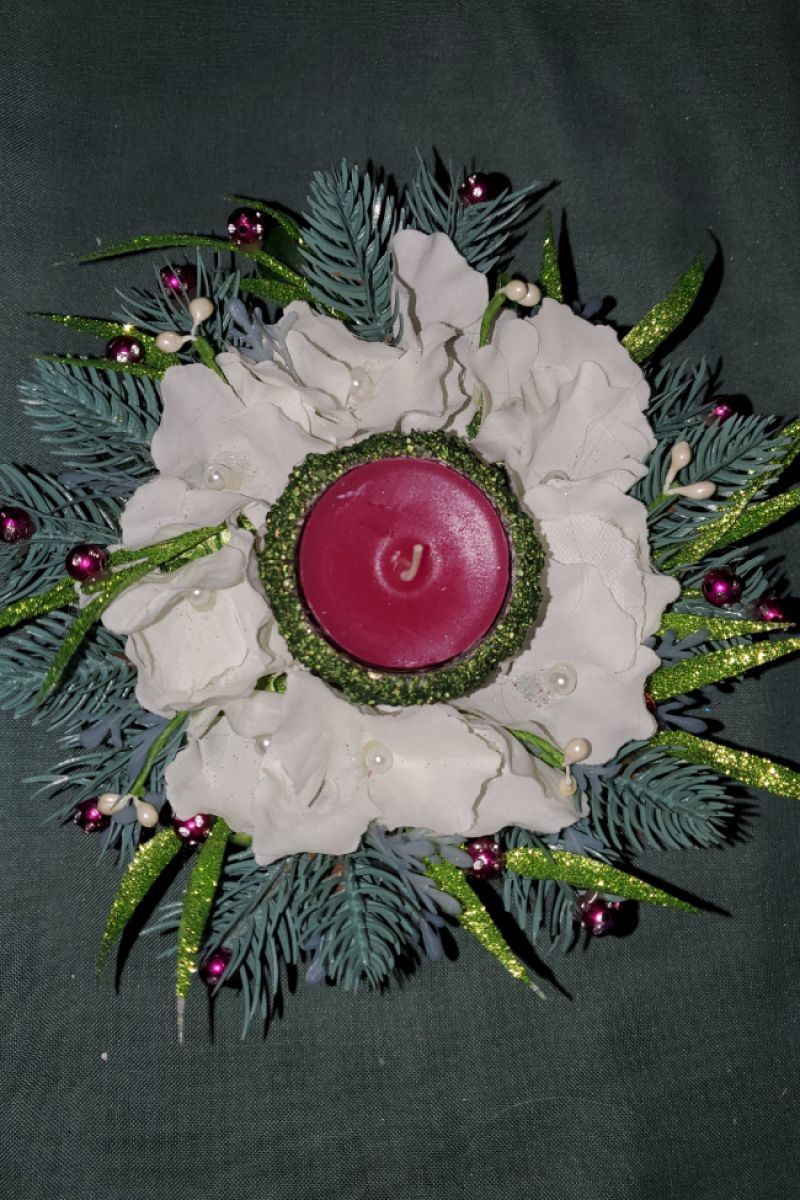 Ікебана на стіл з ємністю для свічки та біліми новорічними квітами, шишками, гілками ялинки, дрібними квітами, листочками, гілками прикрасить ваш будинок, додасть святкового настрою. Основа зроблена с картону, пофорбована и обсипана дрібними камінцями. . Міцно все закріплено, у мішку для зберігання. Буде служити довго. Чудовий подарунок. в святковому мішку.