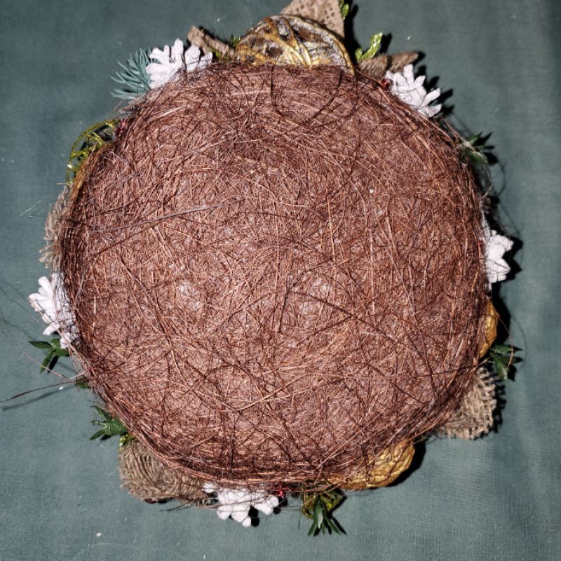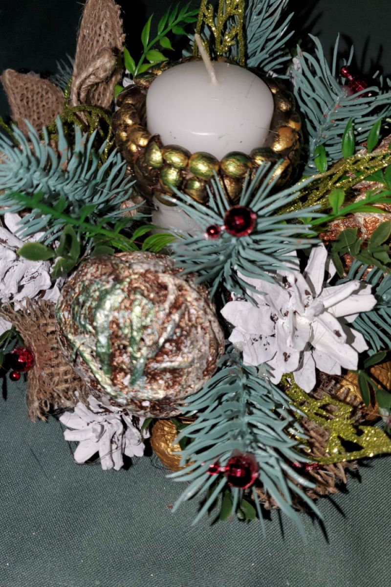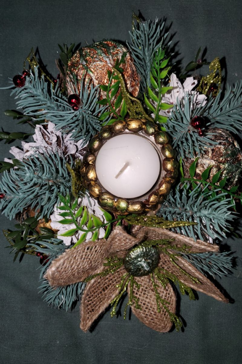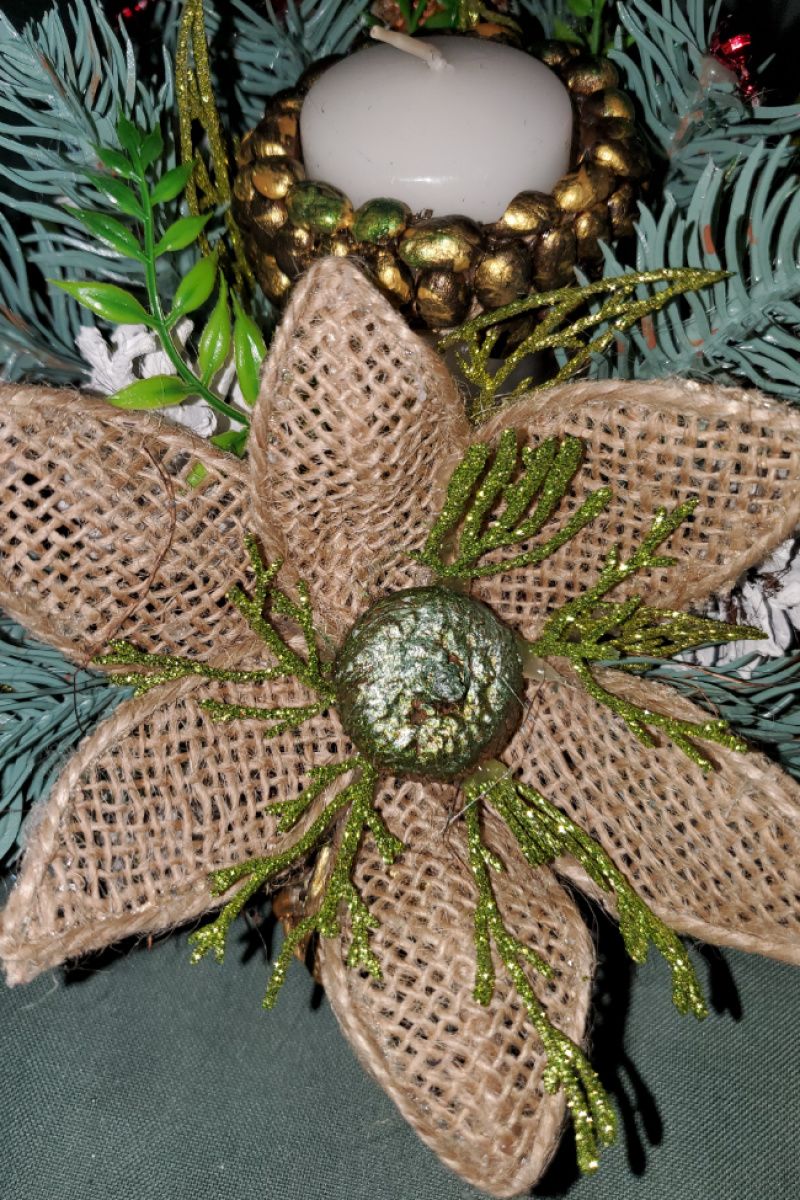 Ікебана на стіл з ємністю для свічки та квітами с мішковини, шишками, гілками ялинки, дрібними квітами, листочками, гілками прикрасить ваш будинок, додасть святкового настрою. Основа зроблена з каркасу обгорнута тканиною, щоб не дряпала стіл. Міцно все закріплено, у мішку для зберігання. Буде служити довго. Чудовий подарунок.