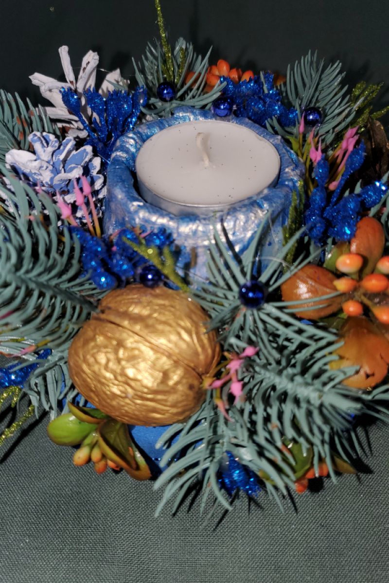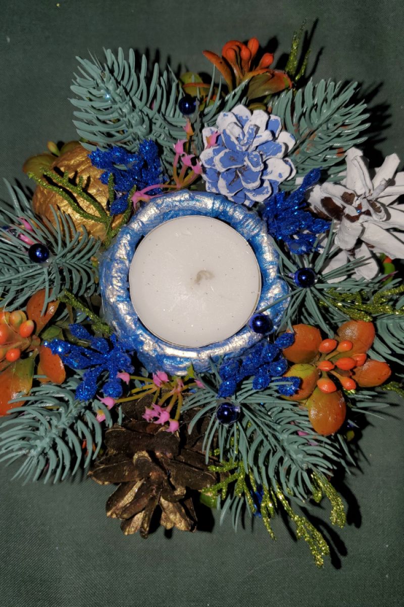 Ікебана на стіл з ємністю для свічки та шишками, гілками ялинки, дрібними квітами, листочками, гілками прикрасить ваш будинок, додасть святкового настрою. Основа зроблена з каркасу обгорнута тканиною, щоб не дряпала стіл. Міцно все закріплено, у мішку для зберігання. Буде служити довго. Чудовий подарунок. в святковому мішку червого кольору.