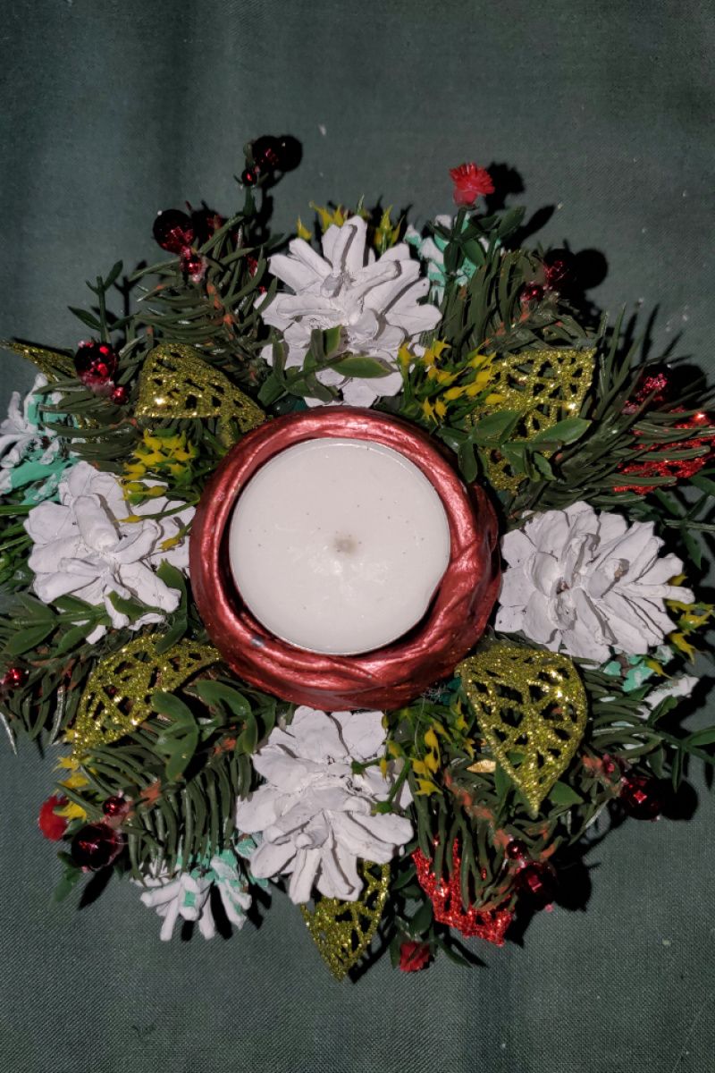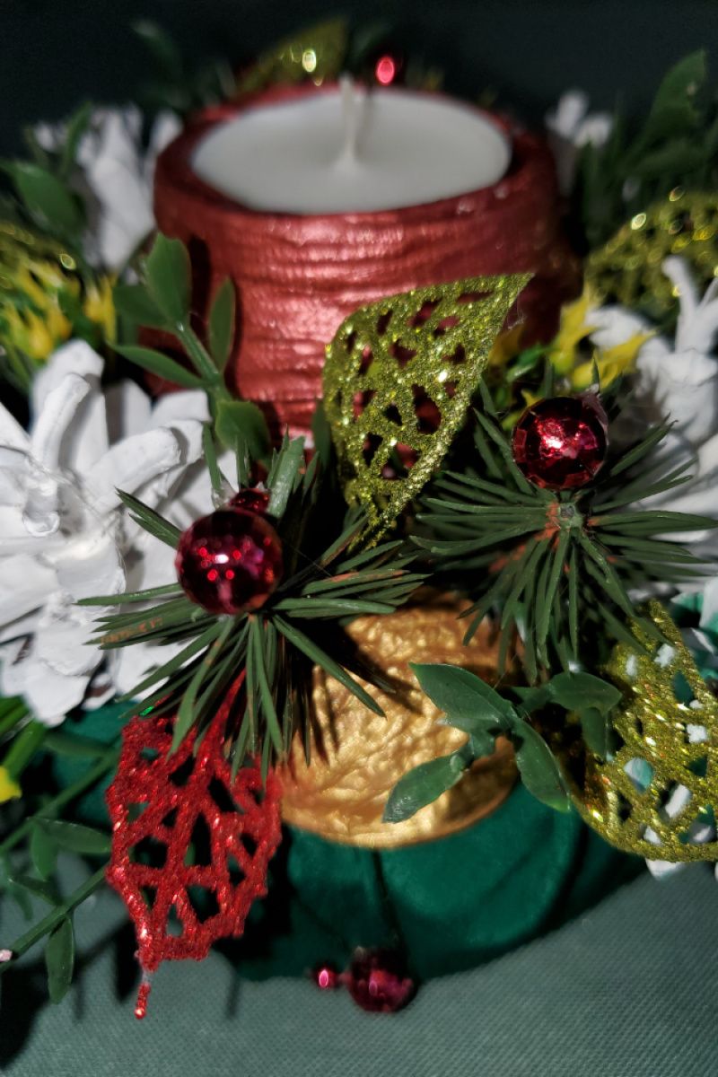 Ікебана на стіл з ємністю для свічки та че новорічними квітами, шишками, гілками ялинки, дрібними квітами, листочками, гілками прикрасить ваш будинок, додасть святкового настрою. Основа зроблена з каркасу обгорнута тканиною, щоб не дряпала стіл. Міцно все закріплено, у мішку для зберігання. Буде служити довго. Чудовий подарунок. в святковому червоно-чорному мішку