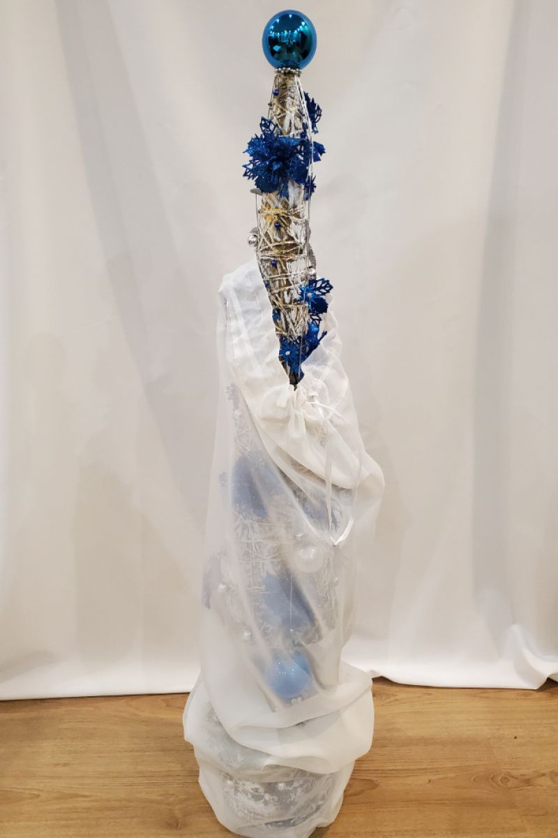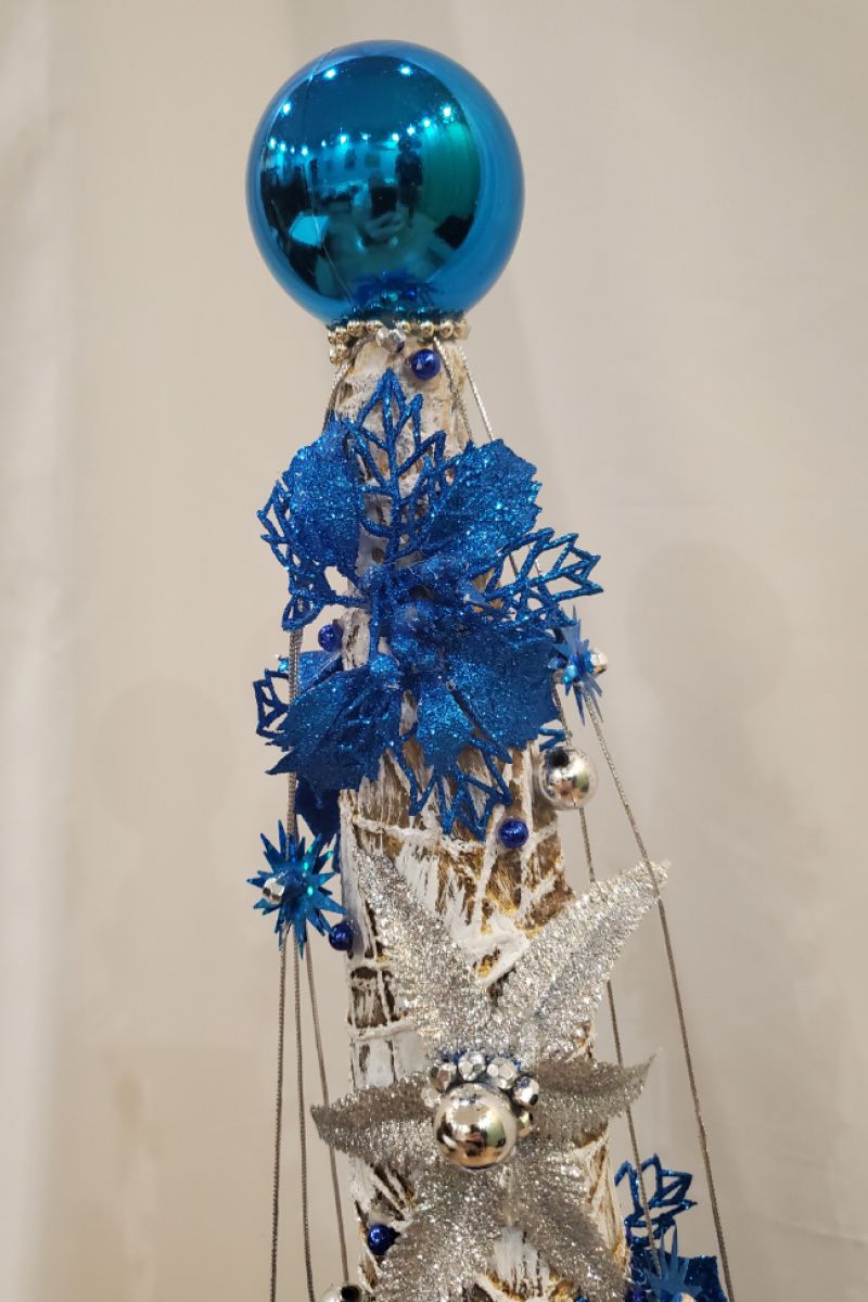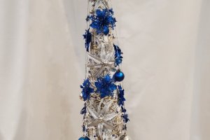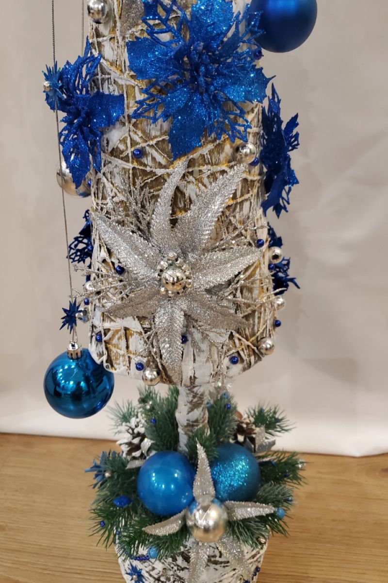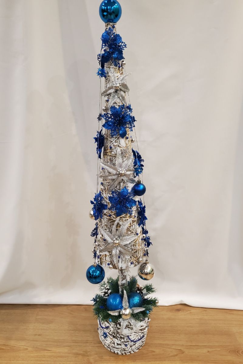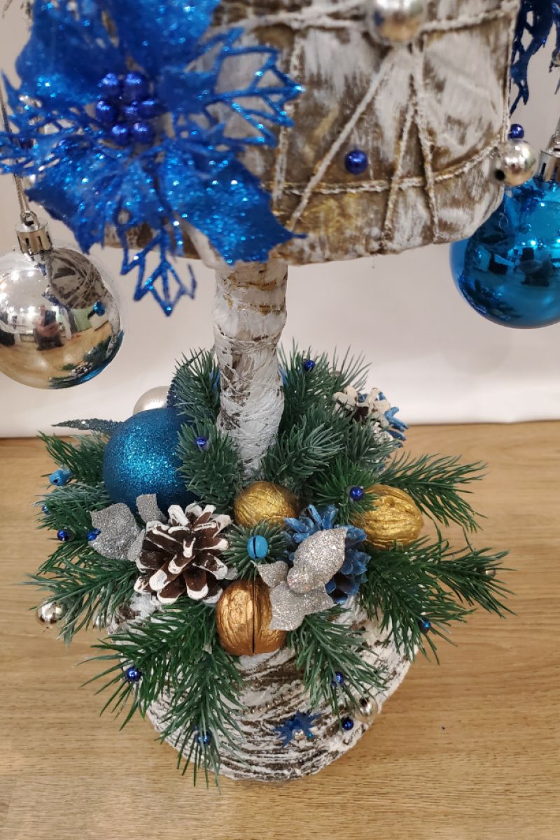 Большая ёлка 1 метр 10см в с синими блестящими цветами, серебрёнными цветами, шары синие и серебрённые, низ украшен искусственной ёлкой орехи, шишки, жёлудь. Ёлка покрыта краской декоративной краской. Акция; при покупке моих изделий на 1000 гривен скидка 10%