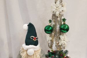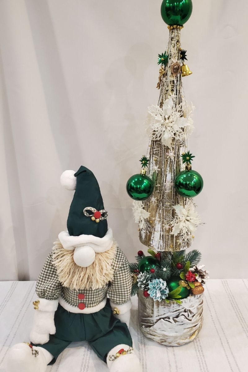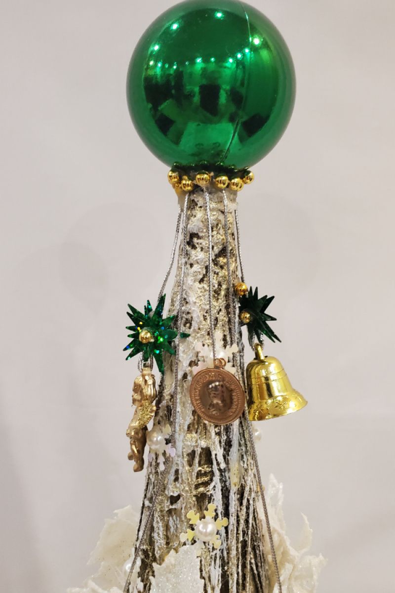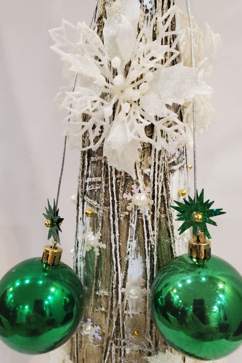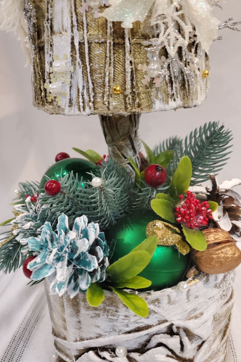 Новогодняя ёлка большая с белыми цветами , шарами зелёными, низ ёлки украшен шарами, шишками, ветками ёлки. Ёлка сделана с картона, ткани окрашена красками несколько тонов,