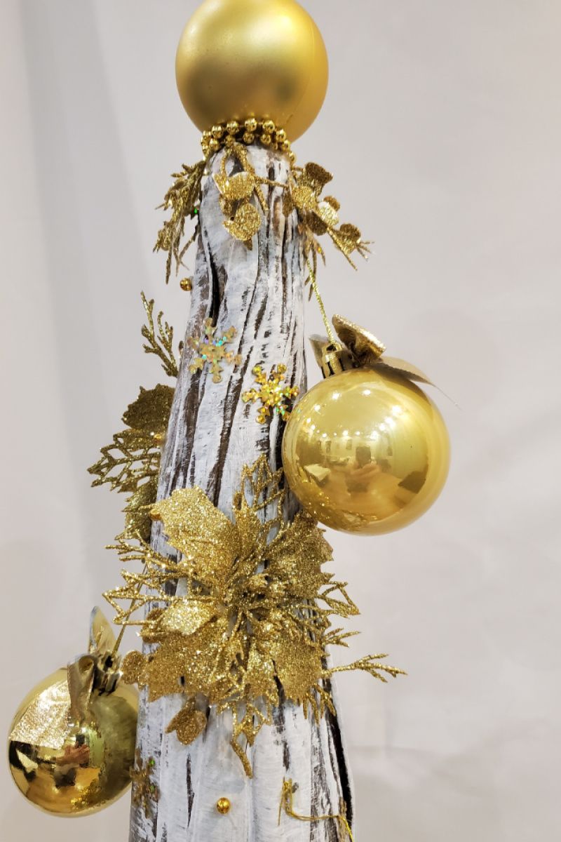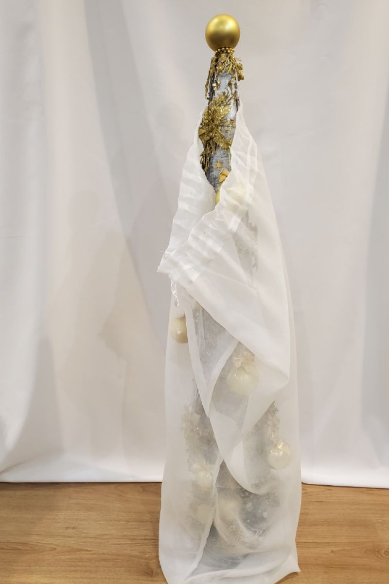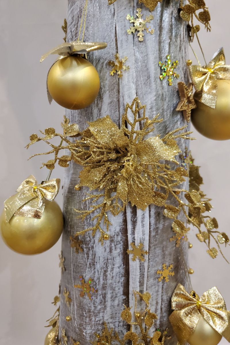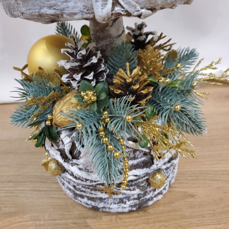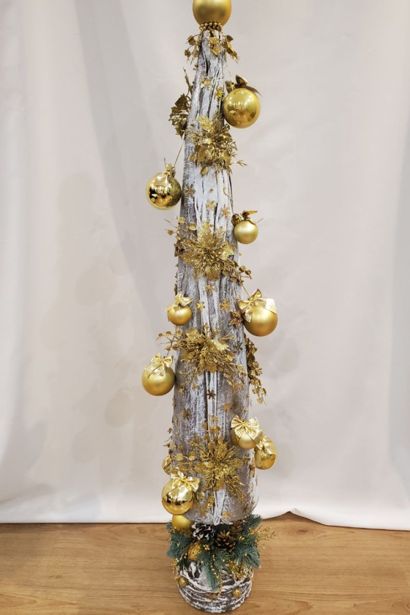 Большая новогодняя ёлка с золотыми шарами и цветами, снежинками, ветками, низ ёлки украшены орехами, шишками, ветками мелких ягод, цветов, ёлки. Ёлка сделана с плотного картона, ткани, краски, тонирована несколькими декоративными красками. не боится влаги, можно ставить на улице. Мешок для хранения. Будет служить не один год. Удобна 5 минут и установили, и так же за 5 минут убрали.