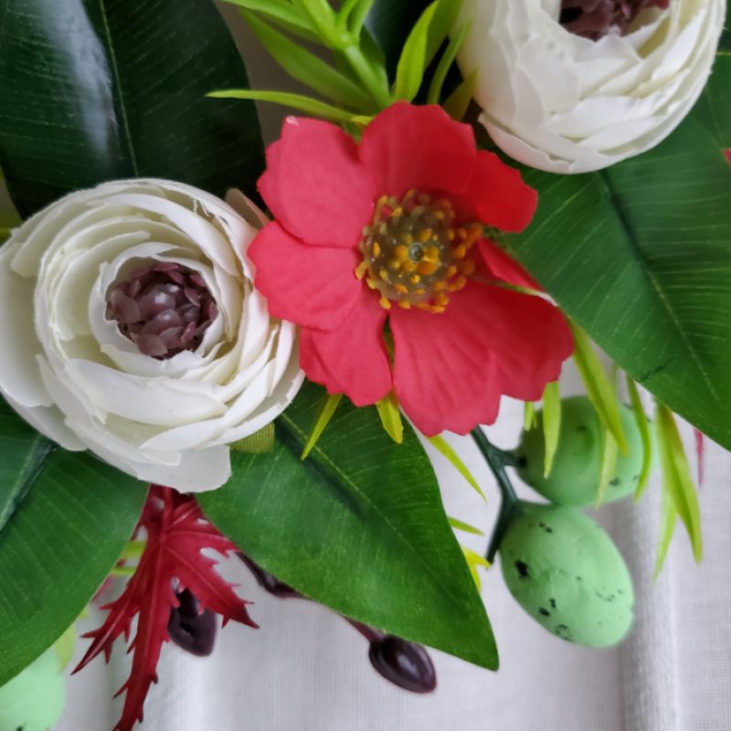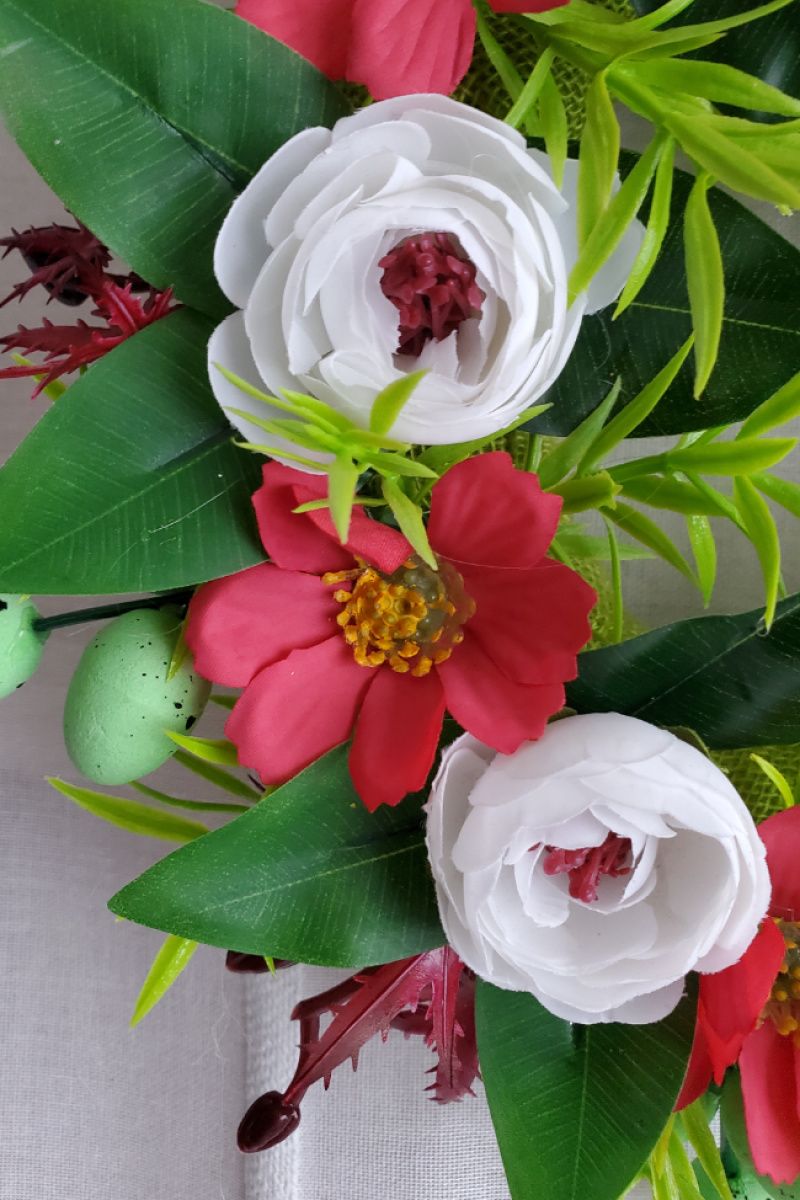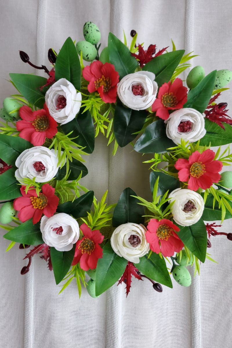 Венок с белыми пионами и красными ромашками диаметр 25см, украшен зеленью, мелкими цветами, яйцами - можно повесить на дверь, стенку или украсить стол, поставив внутрь свечу (не забудьте о технике безопасности - лучше в стеклянную ёмкость). Мягкая основа - не поцарапает поверхность и более долговечная (чем основа с лозы - пересыхает).