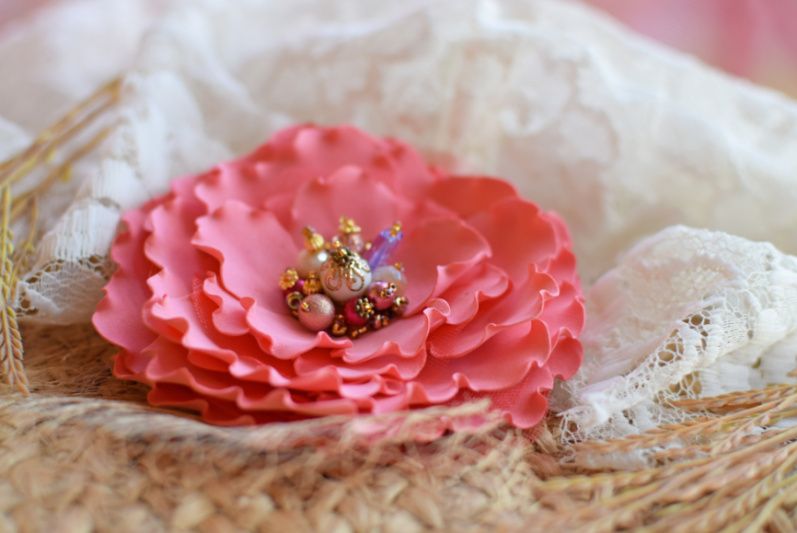 Цветок изготовлена из фоамирану и фатина расшитая различными каминьцямы и бисером. Брошь станет прекрасным дополнением к вашей одежде или эксклюзивным подарком на любой праздник. Благодаря универсальному креплению цветок можно зацепить и в волосы и как брошь.
