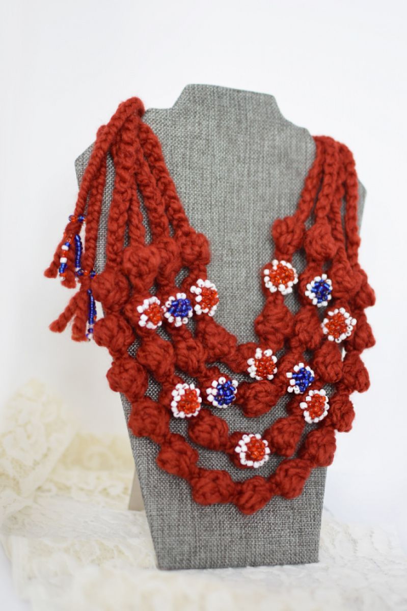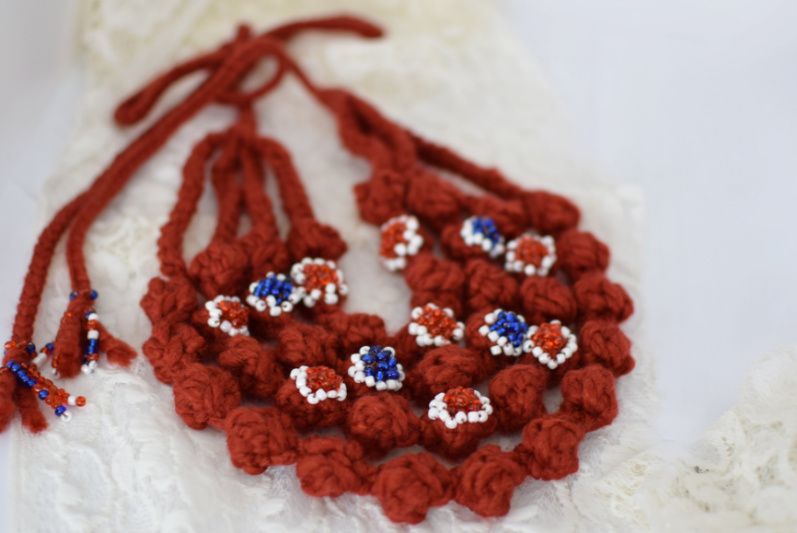 Прекрасное пышное ожерелье ручной работы, состоящее из вязаных рядов с шишечками в авторской технике вязания и расшитое бисером. Ожерелье мягкое, легкое и идеально подойдет к аутентичной фотосессии, также ожерелье прекрасно дополнит Вашу повседневную одежду или станет хорошим эксклюзивным подарком для родных и близких людей.