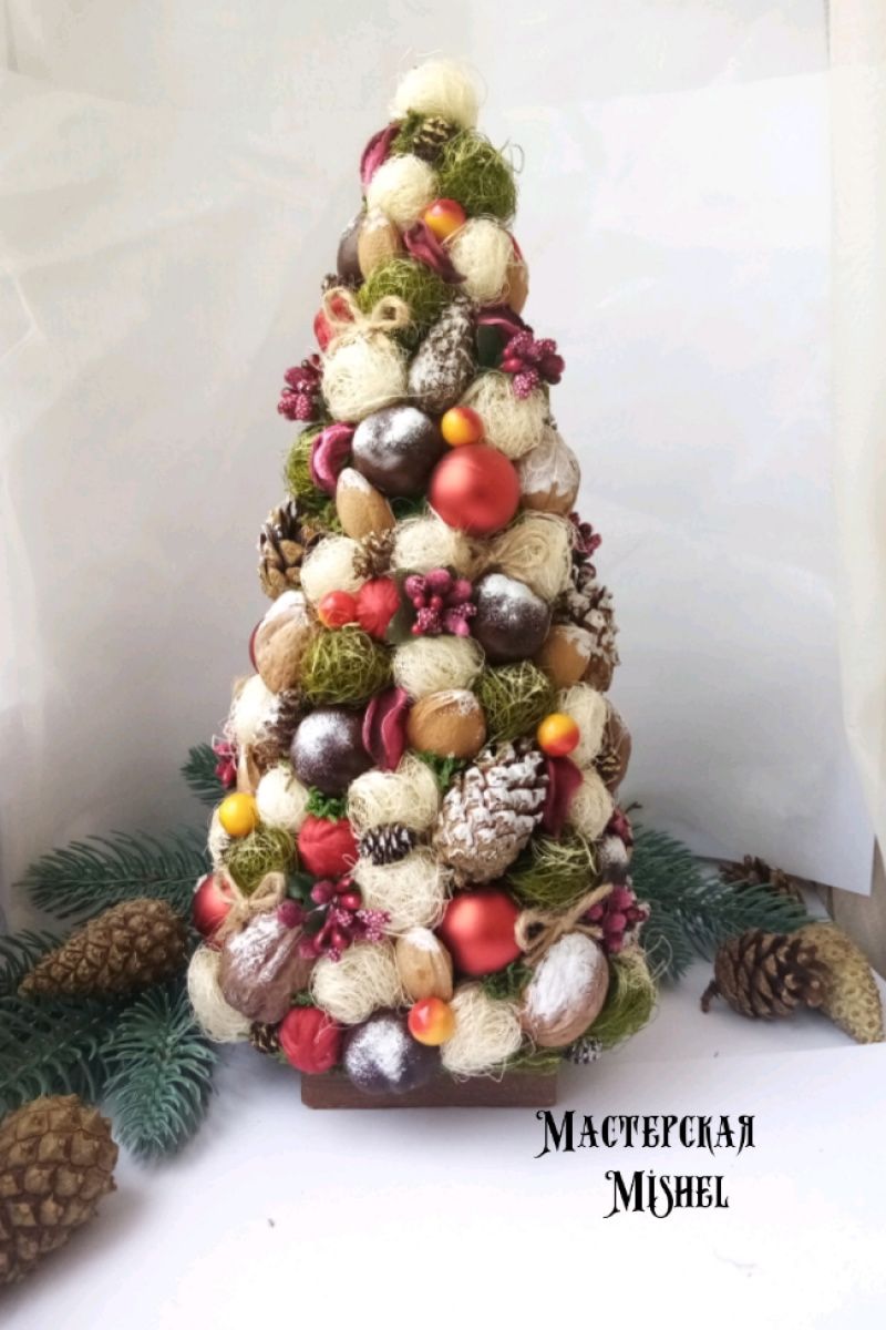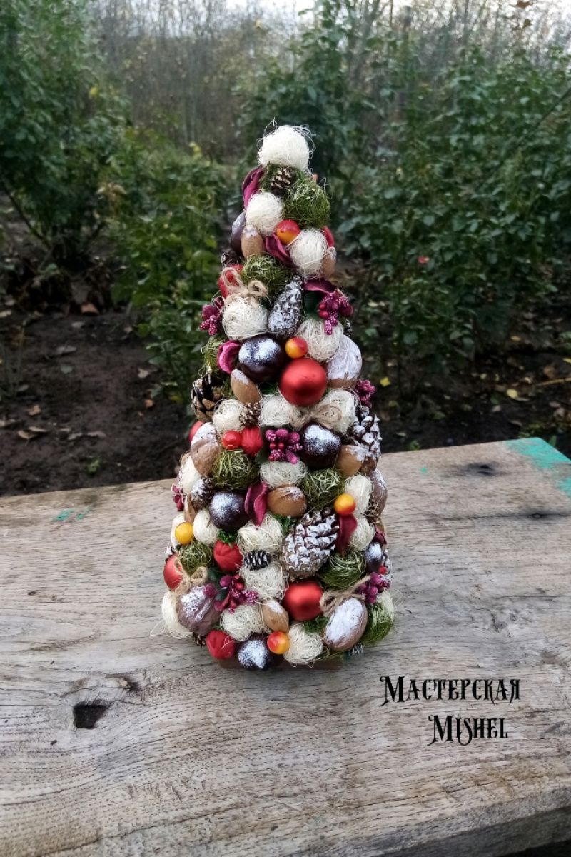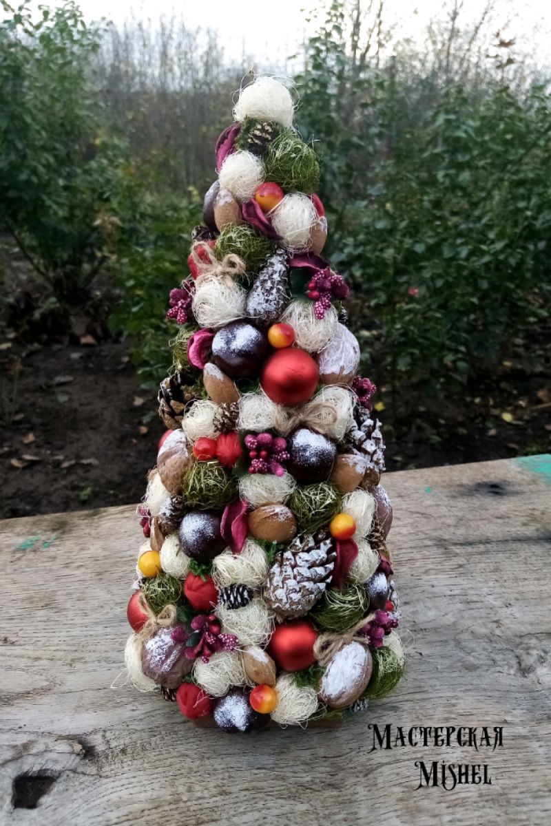 Ёлочка с бордово красными оттенками, на деревянной подставке, сделана из природных и декоративных материалов.