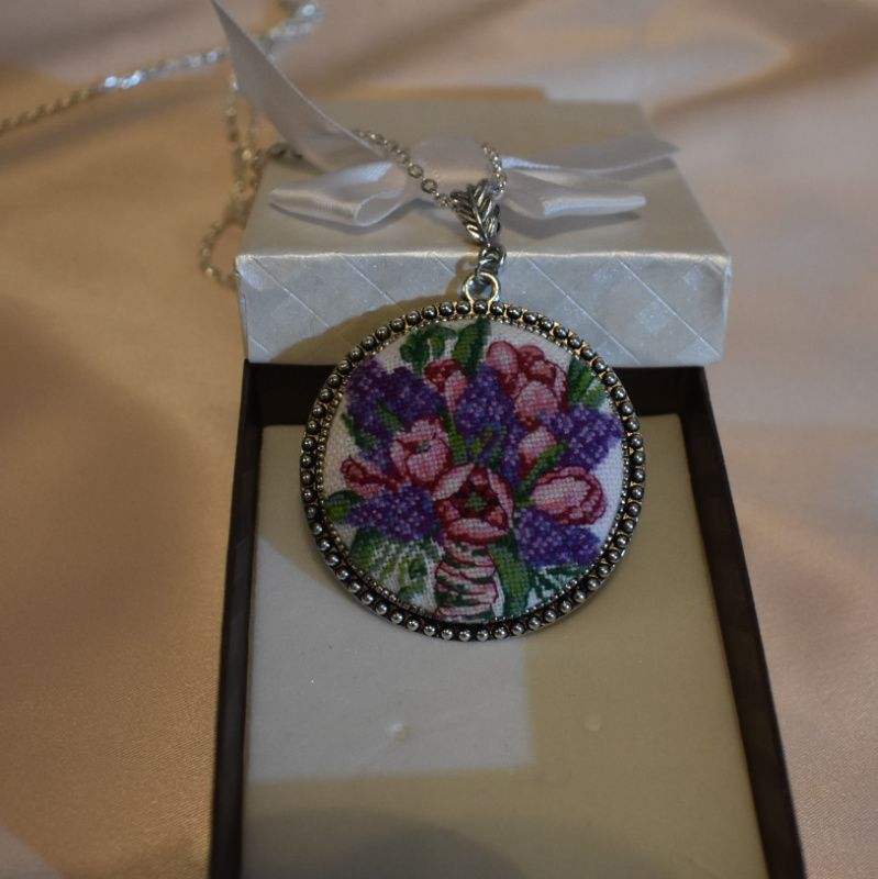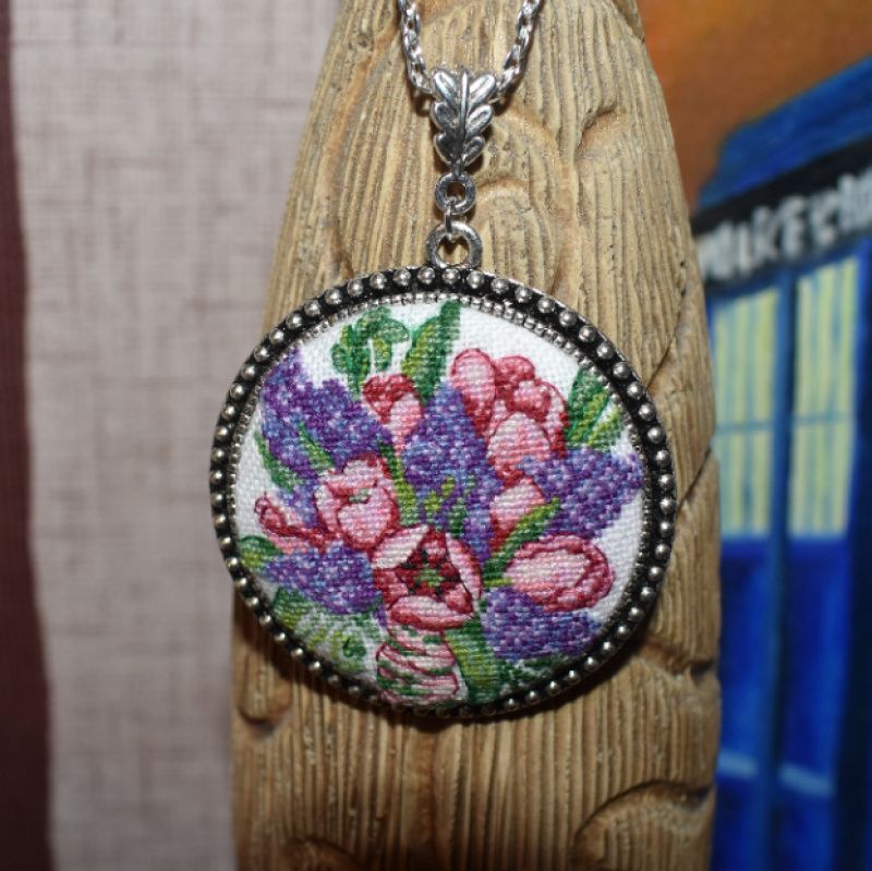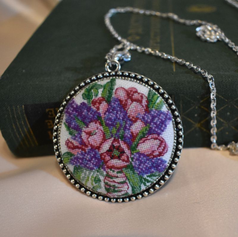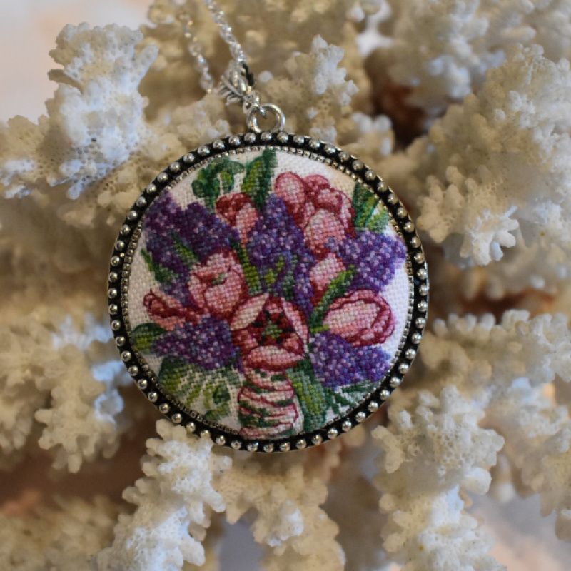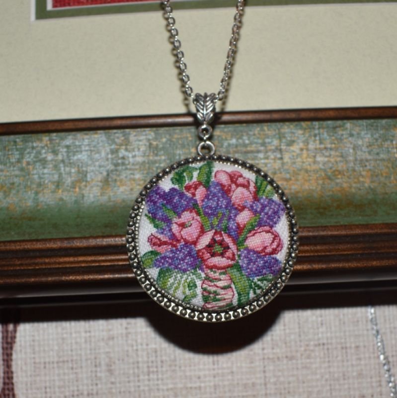 Оригинальный яркий кулон с весенними цветами выполнен в технике микровышивка крестиком.