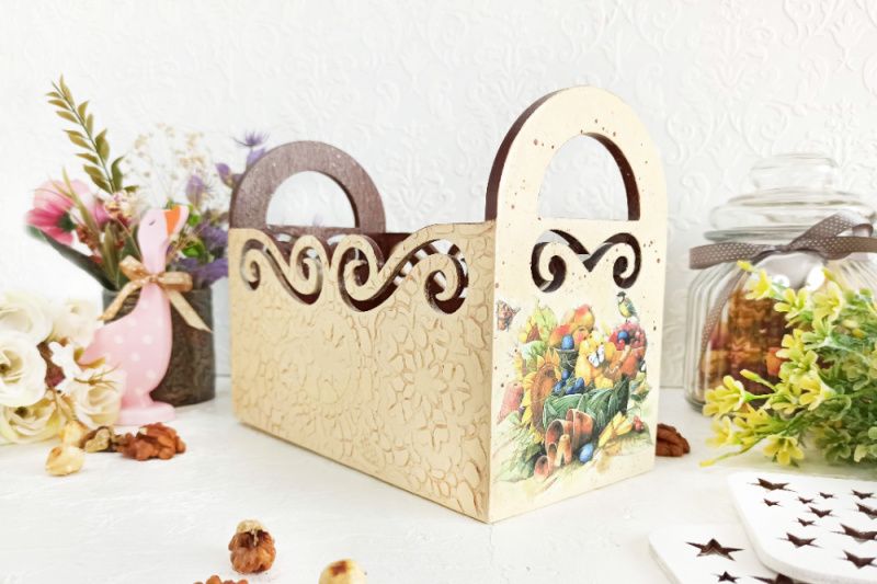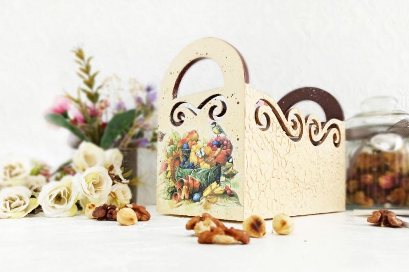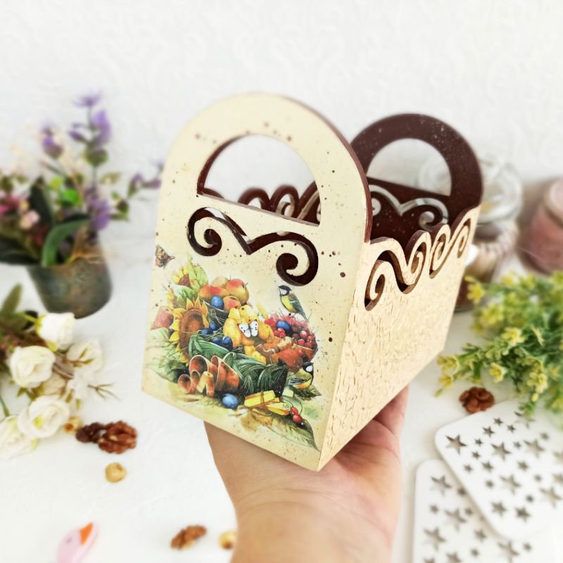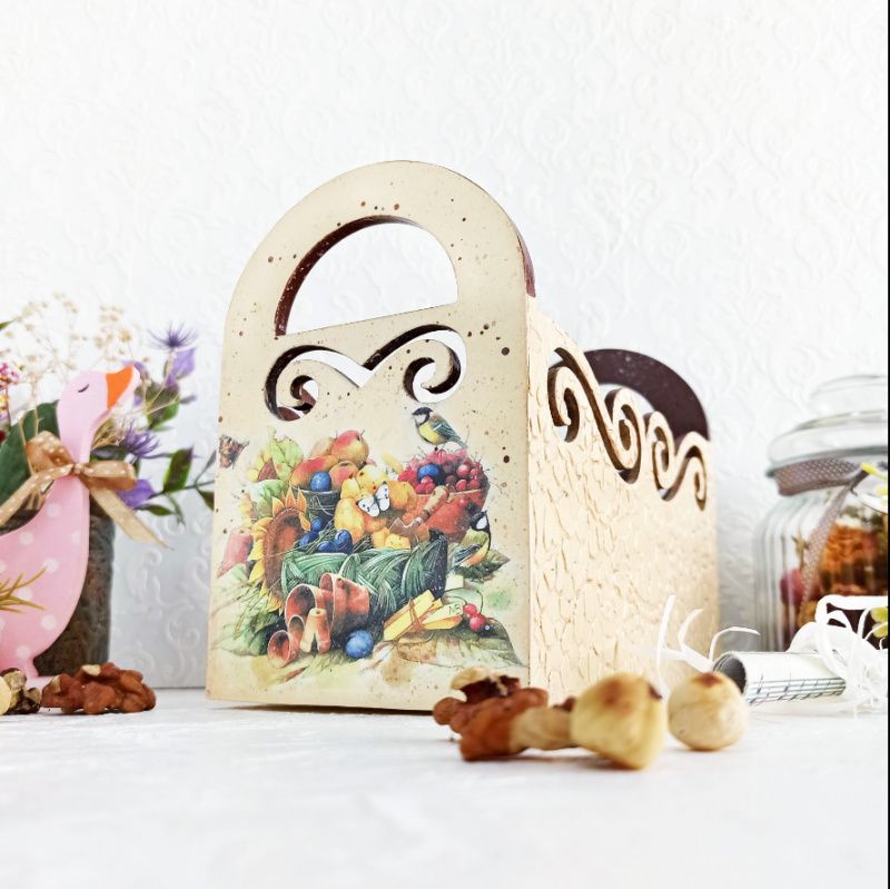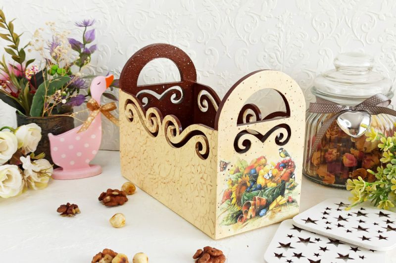 Работа выполнена в теплых тонах с интересным мотивом и объемным фактурным рисунком по бокам