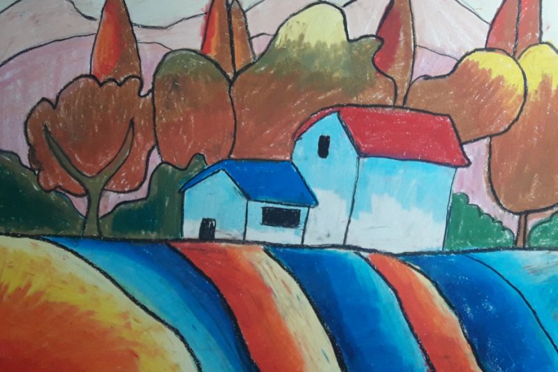 Уютная и теплая картина, которая украсит любое жилище. Дома 50х70 см, акварельная бумага, масляная пастель под матовым лаком. Пересылка в тубусе.
