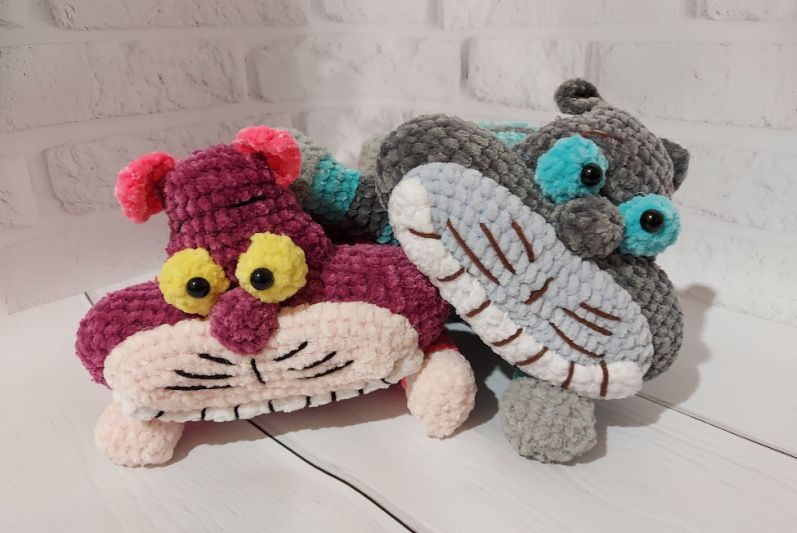 Чеширский кот, связан из плюшево гипоаллергенной пряжи, размер игрушки в длину вместе с хвостом 28 см.