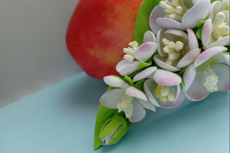 На фото цветы яблони, выполнены из фоамирана. Крепление - заколка-крокодильчик, но может быть по Вашему желанию(обруч, повязка, резинка). Размер от листика до листика 13,5 см.