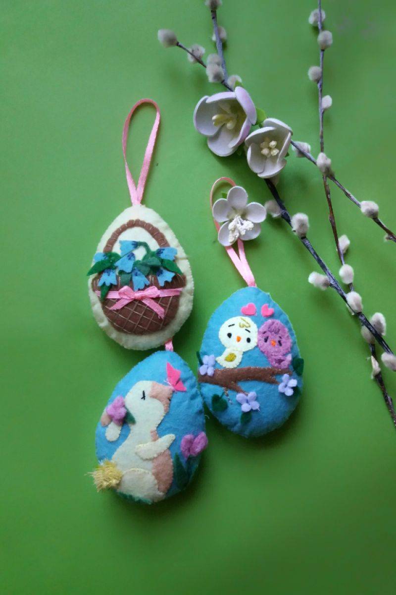 Подвески для украшения Вашего дома на пасху с весенними мотивами, Яйца пошиты из фетра, вручную и декорированы вышитыми элементами. Набор 3 шт.