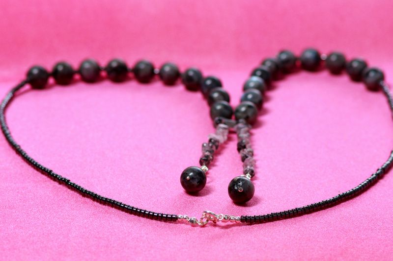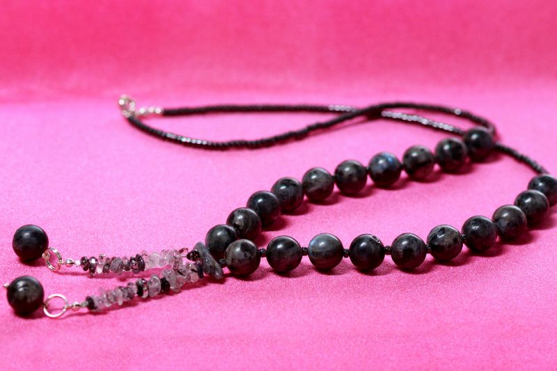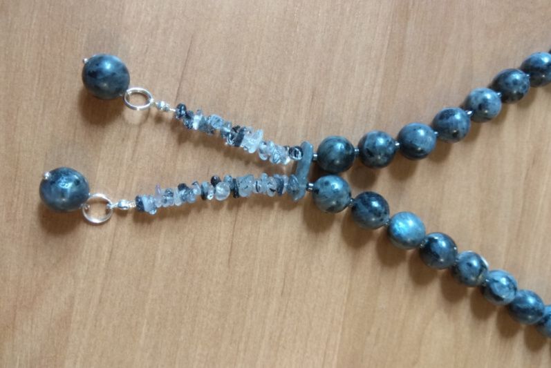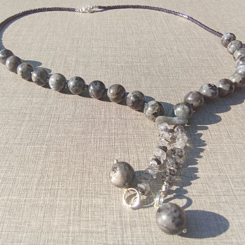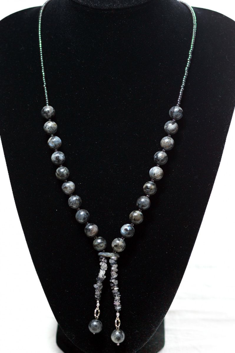 колье изготовлено из лабрадора 12 мм, гематита 2х3мм, имеет 2 подвески с турмалинового кварца 3х6 мм и лабрадора, застежку и фурнитуру из серебра. Лабрадор - минерал, является разновидностью лунного камня с невыразительным на первый взгляд синеватым окраской, но умело обработанный он начинает играть всеми цветами радуги. Именно это свойство называется иризация или лабрадоризациею, интересно, что ученым до сих пор не удалось разгадать ее секрет. Украшения из лабрадором подчеркивают изысканный вкус, эрудицию и индивидуальность своего владельца. В свою очередь гематит положительно влияет на химический состав крови, лечит анемию, дает возможность организму быть в тонусе.