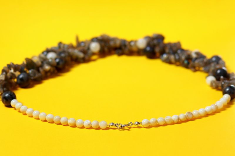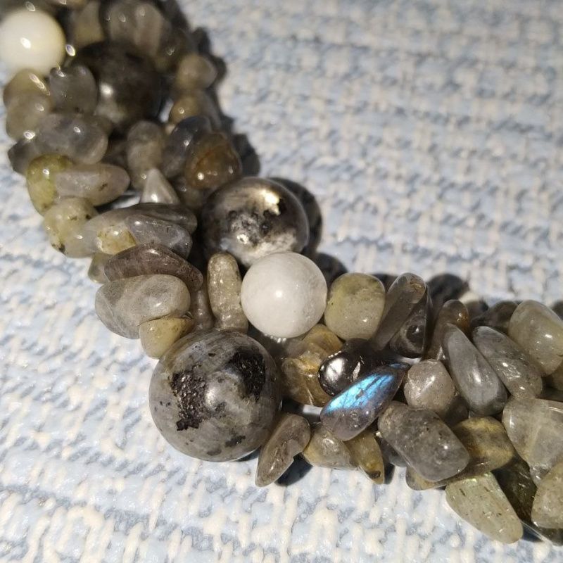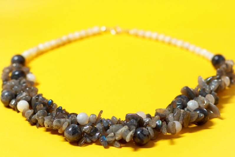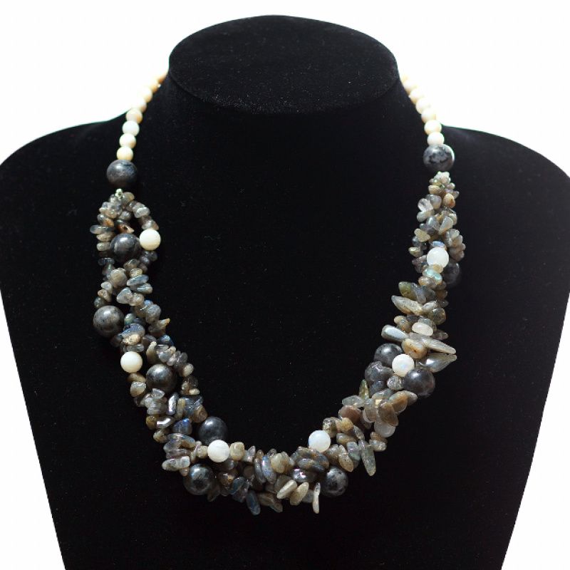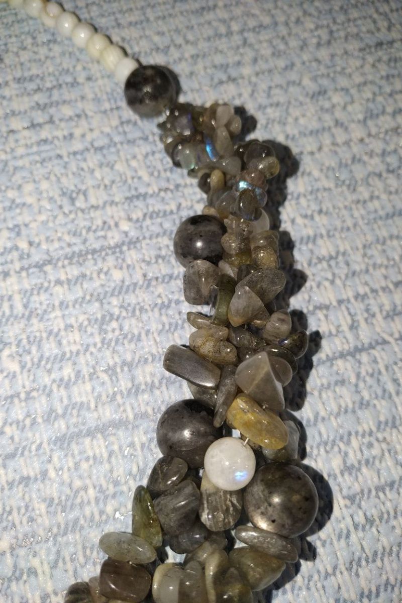 Колье изготовлено из сколов камня лабрадорита 2х6мм, бусин лабрадорита 12мм, бусин адуляра (лунного камня) 9мм, морского перламутра 6,5мм, Лабрадор - минерал, является разновидностью лунного камня с невыразительным на первый взгляд синеватым окраской, но умело обработанный он начинает играть всеми красками радуги. Именно это свойство называется иризация или лабрадоризациею, интересно, что ученым до сих пор не удалось разгадать ее секрет. Украшения из лабрадором подчеркивают изысканный вкус, эрудицию и индивидуальность своего владельца.