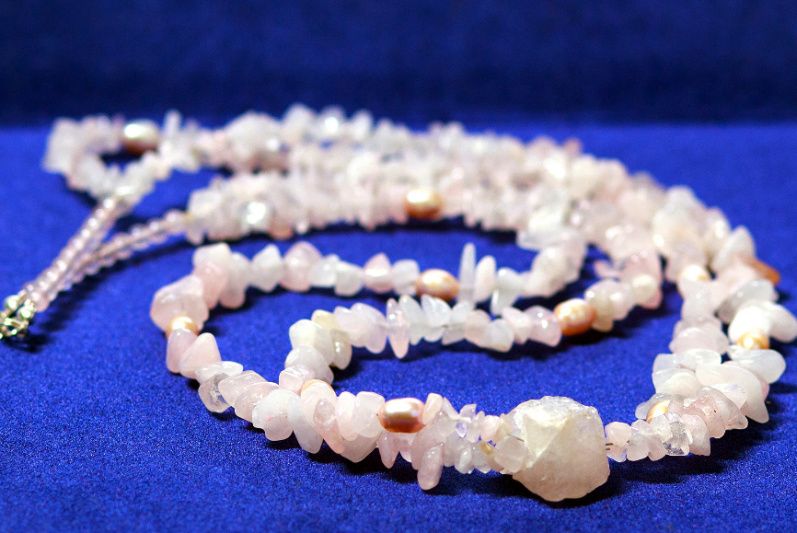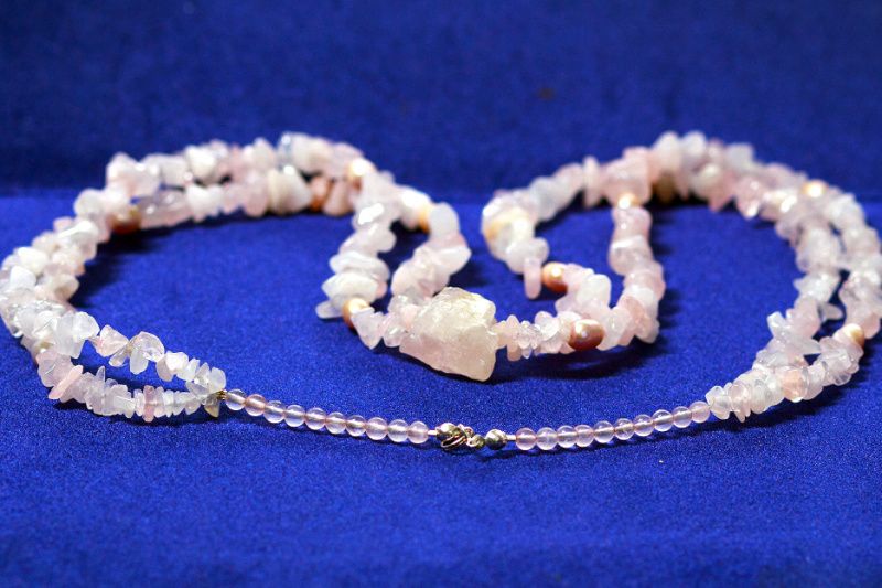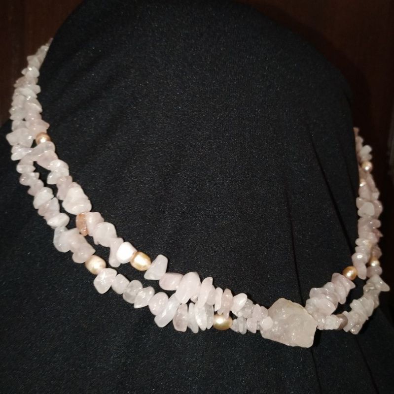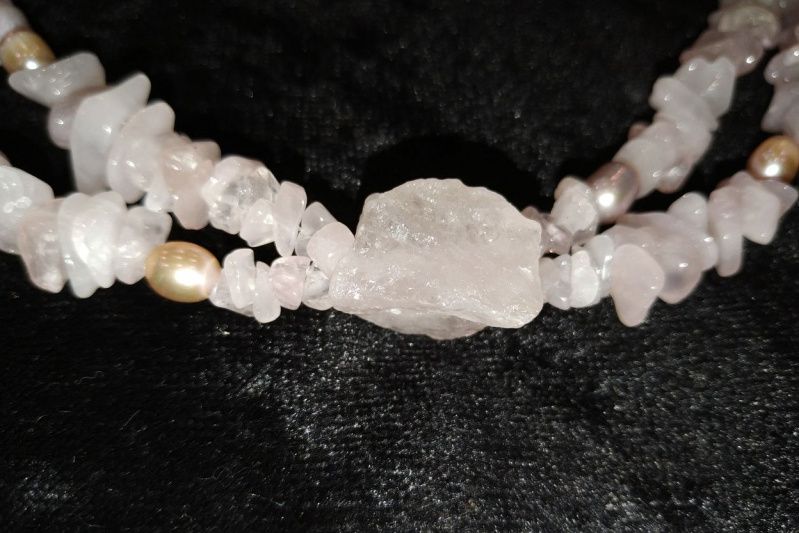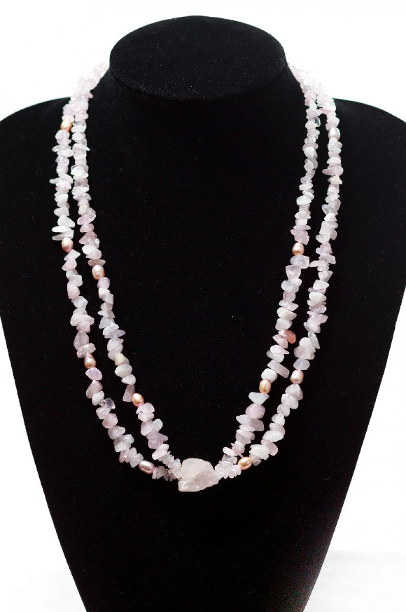 Колье изготовлено из двух низок натурального розового кварца и речного жемчуга, декорированное большим необработанным квацем-самородком 25мм, имеет застежку и фурнитуру из серебра. Розовый кварц полудрагоценный нежный самоцвет, который определяется прозрачностью, легкостью оттенка и уникальной красотой. Считается, что этот камень приносит удачу, притягивает любовь и симпатию противоположного пола. Розовый кварц является семейным талисманом, который приносит взаимную любовь и взаимопонимание. Еще с древних времен розовый кварц использовали в косметических целях, и теперь доказано, что он заметен положительное влияние на регенерацию клеток кожи, также его часто используют в спа процедурах. Еще одно интересное свойство рожевоо кварцу- это способность нейтрализовать электромагнитное излучение от бытовой техники, для этого лучше всего подходит именно необработанный кварц. Поэтому данное ожерелье подарит своей обладательнице житерадиснисть, откроет мир в позитивном свете, освежит внешность и ее глаза засияют по-новому.