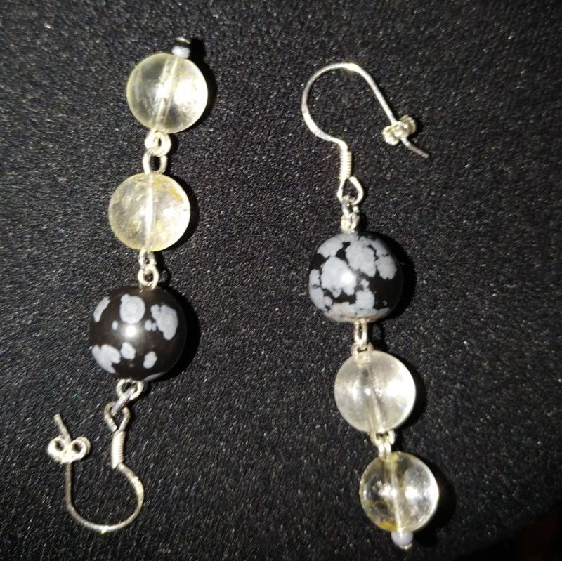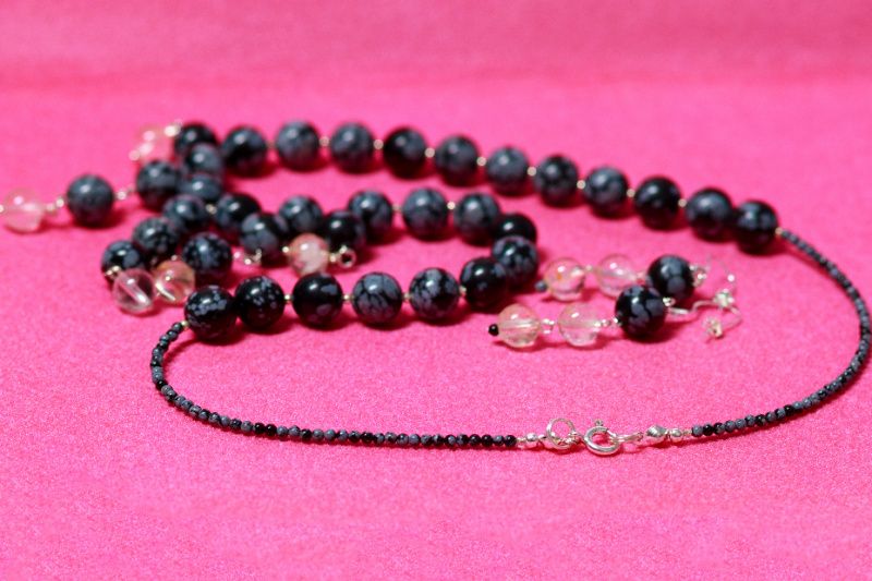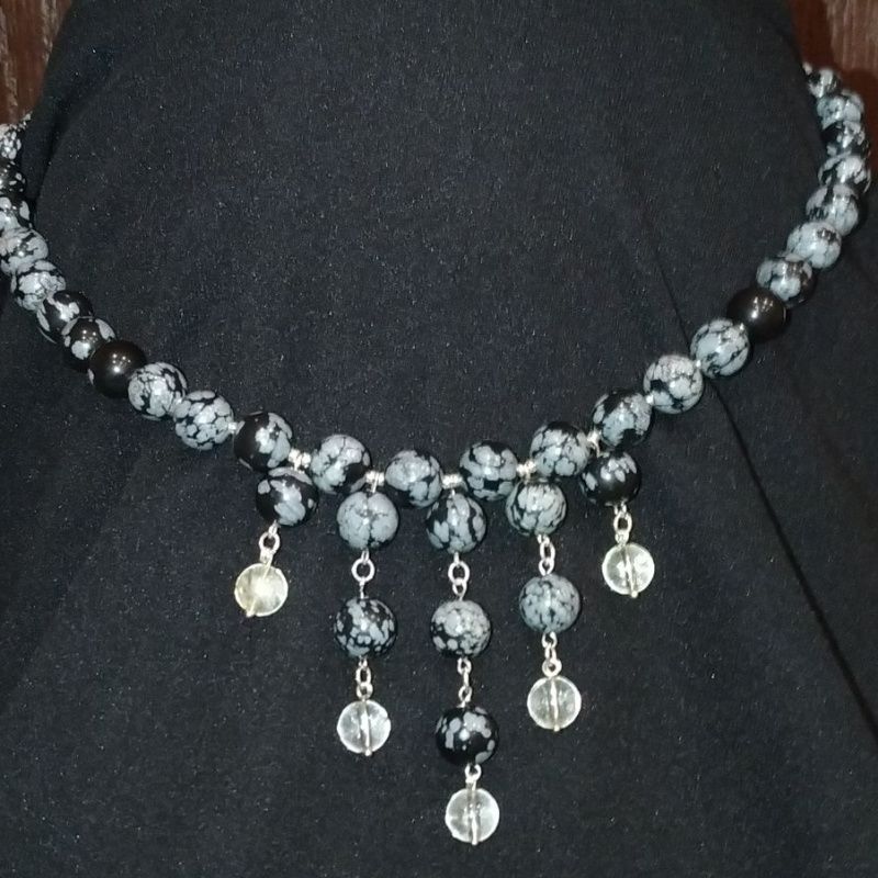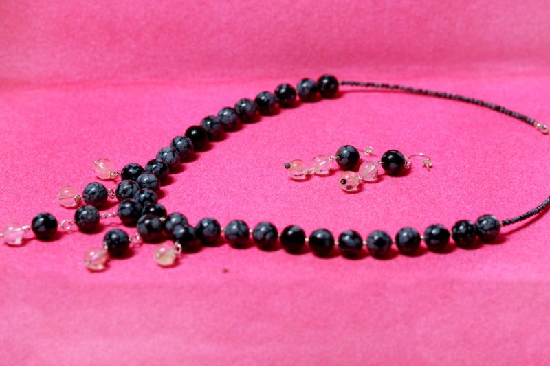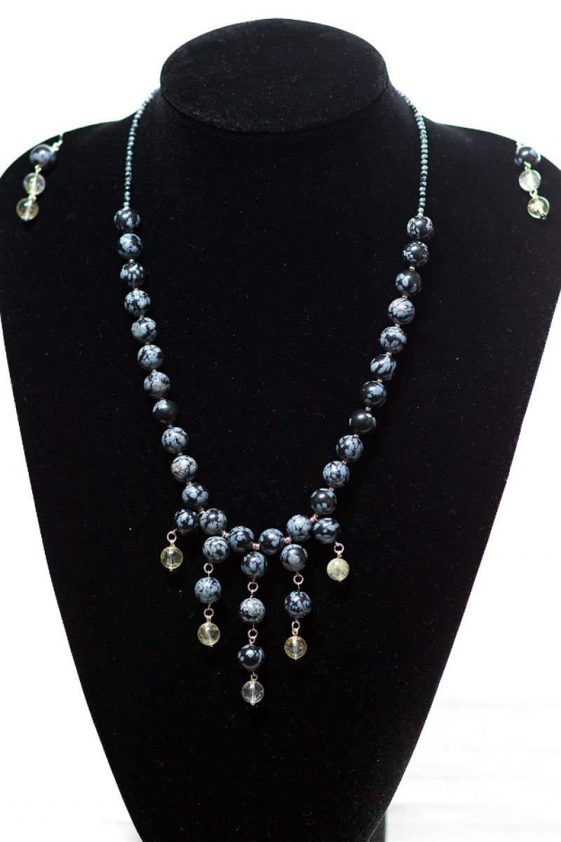 Набор состоит из колье и сережек. Колье изготовлено из снежного обсидиана 10мм и 2 мм, имеет 5 подвесок с обсидиана и горного хрусталя 8мм, имеет застежку и фурнитуру из серебра. Серьги изготовлены из снежного обсидиана 10мм, горного хрусталя 8мм и серебряной фурнитуры. Обсидиан- необычный камень, рожденный в сердце вулкана и несет в себе силу нашей планеты. Это достаточно редкий камень, его находят только в местах древних вулканов и поселений древних людей, которые изготавливали из него для себя первую оружие. Считается, что обсидиан подходит только честным и сильным людям. Кроме того, украшения из обсидиана всегда выглядят солидно и респектабельно, всегда добавляют нотку шарма.
