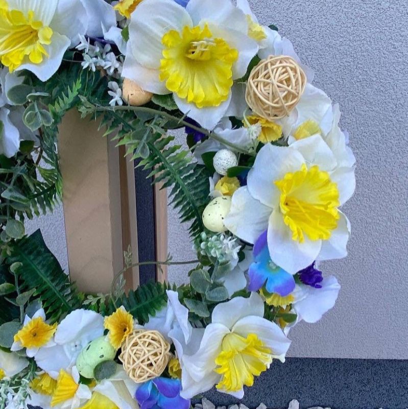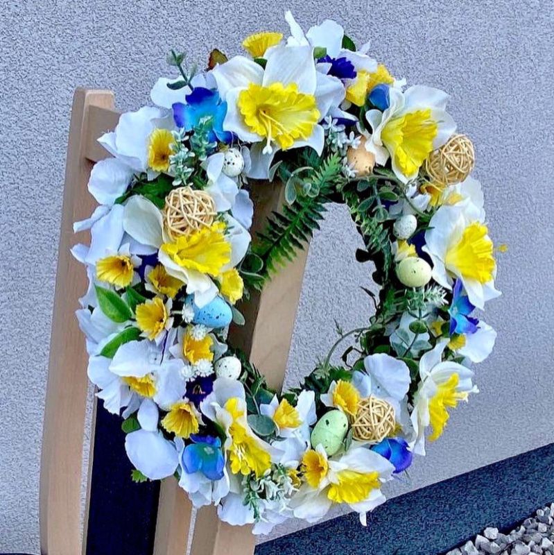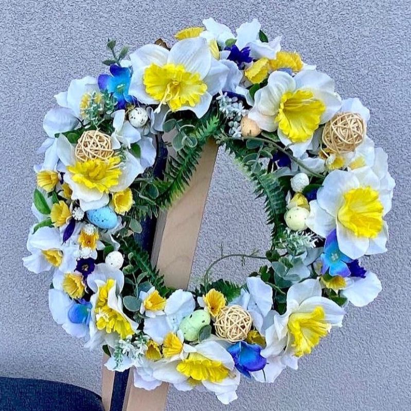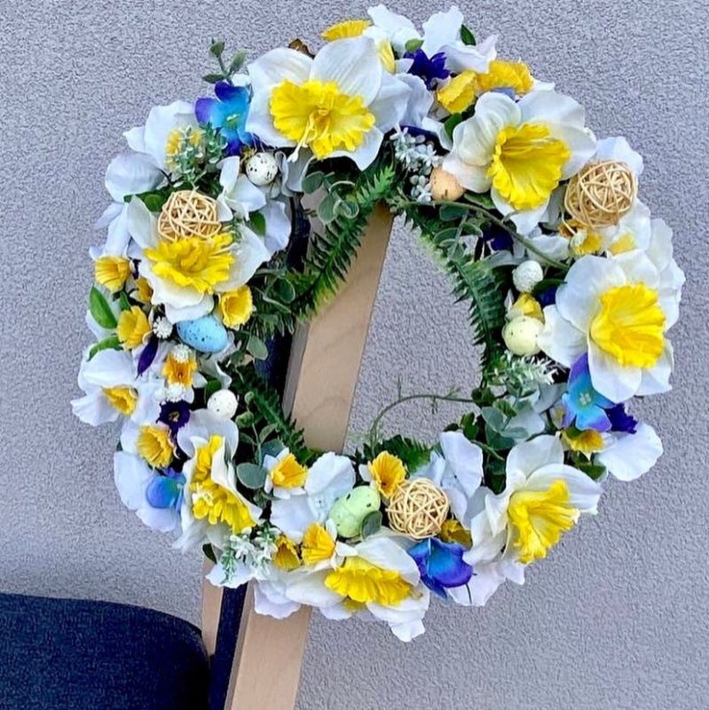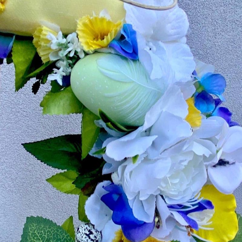 Кольри говорят сами за себя! Венчик на лозе, сочетание голубых, желтых и зеленых цветов с фиолетовым вкраплениями и с цветными яичками и шариками из ротанга.