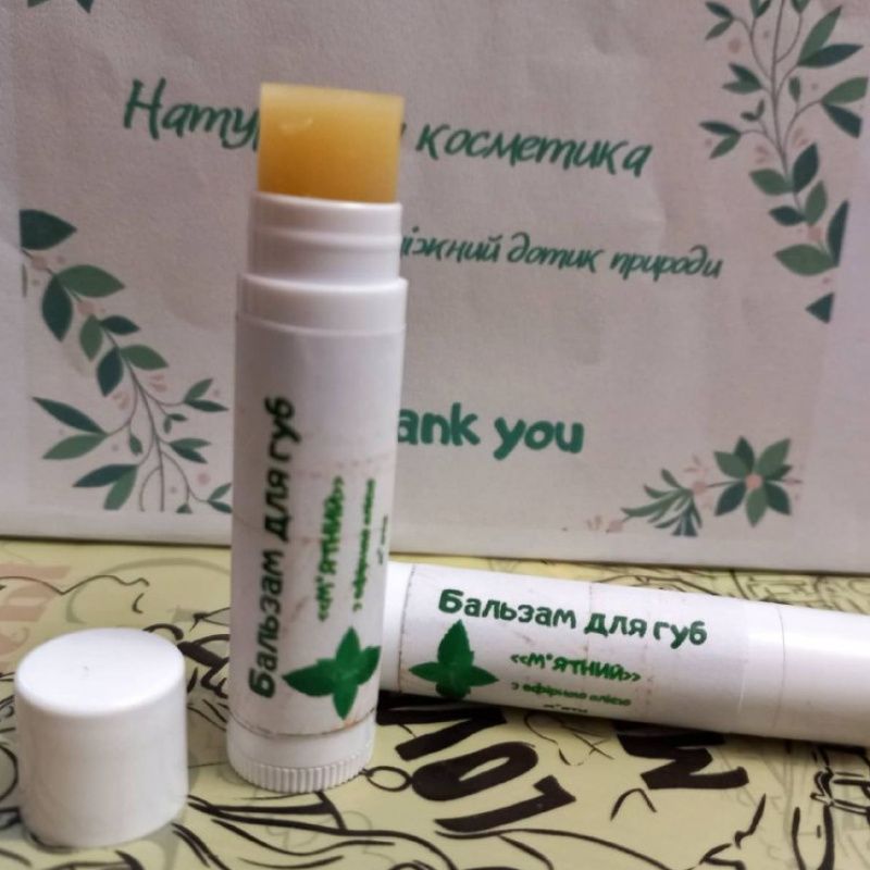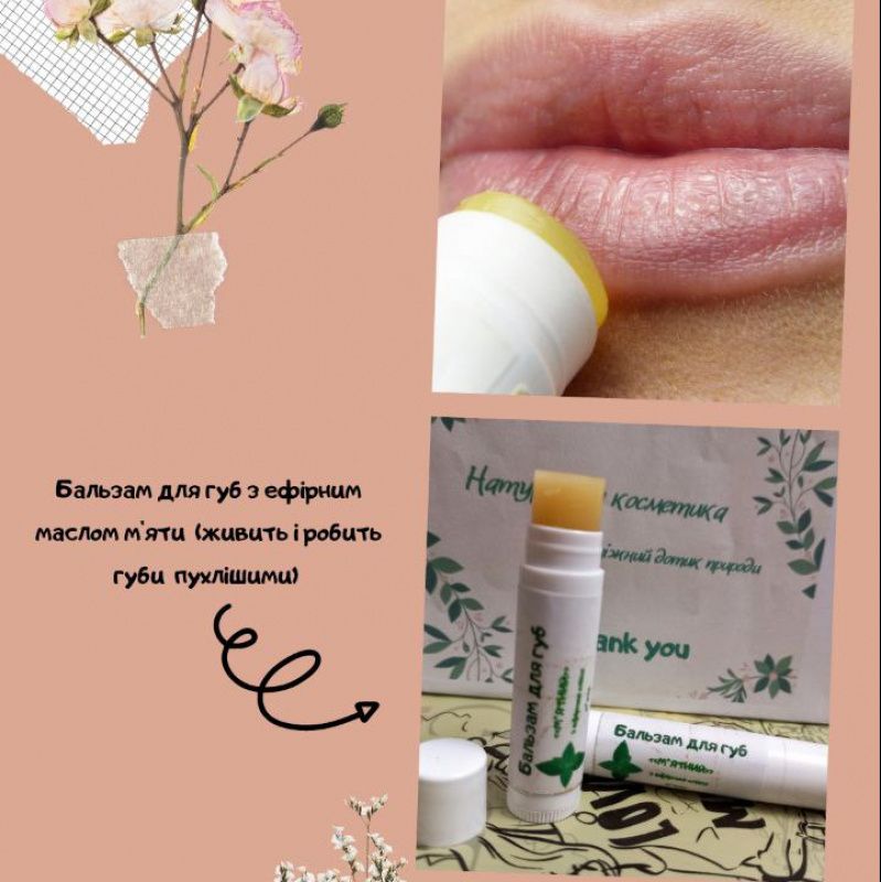 Бальзам ухаживает за губами, увлажняет их и смягчает, защищает от проникновения инфекций. Создавая тоненький защитный слой, препятствует потере влаги, пересыханию и обветриванию, придает губам естественный блеск. Бальзам для губ с эфирным маслом мяты - (питает и делает губы более пухлыми) Состав: Состав: масло ШИ, Кокосовое масло, Какао мамсло, мацерат бархатца, оливковое масло, рациновое масло. пчелиный воск воск, ланолин, эфирное масло мяты.