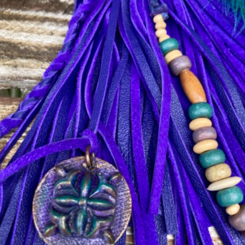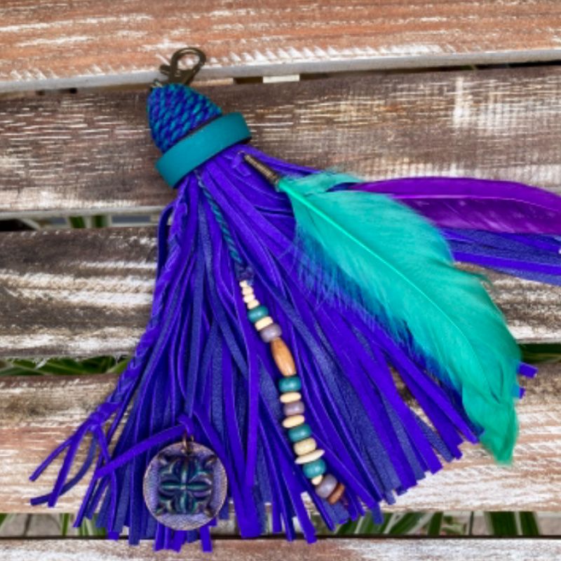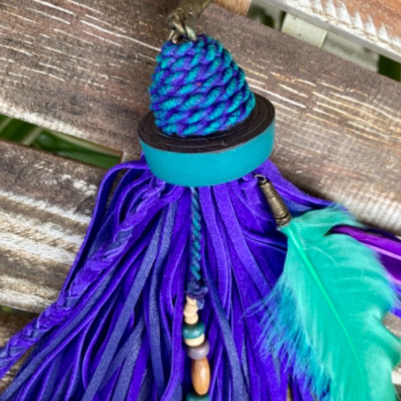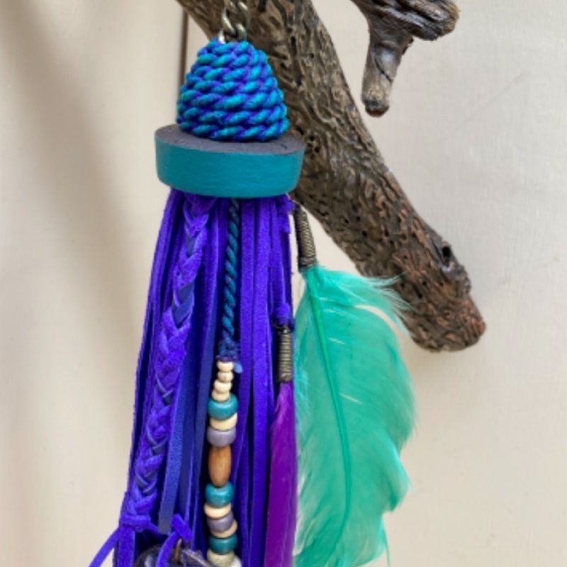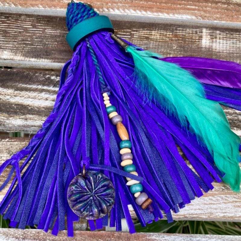 Брелок из натуральной кожи длинная фиолетовая кисть, декорированная перьями, бусинами, двусторонним медальоном, на карабине. Уникальная авторская ручная работа с плетеным замшевым шнуром и бахромой. Сочетание фиолетового и голубого цветов. Отлично подойдет любителям стилей бохо, хиппи, вестерн. Украшение брелок для ключей, сумок, одежды, мебели, интерьера. ЭКО продукт. Оригинальный подарок для нее. Материалы: натуральная замша, натуральная кожа, бусины, деревянные бусины, медальон, карабин. Размер: длина кисти с карабином 24 см.
