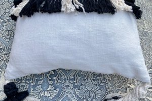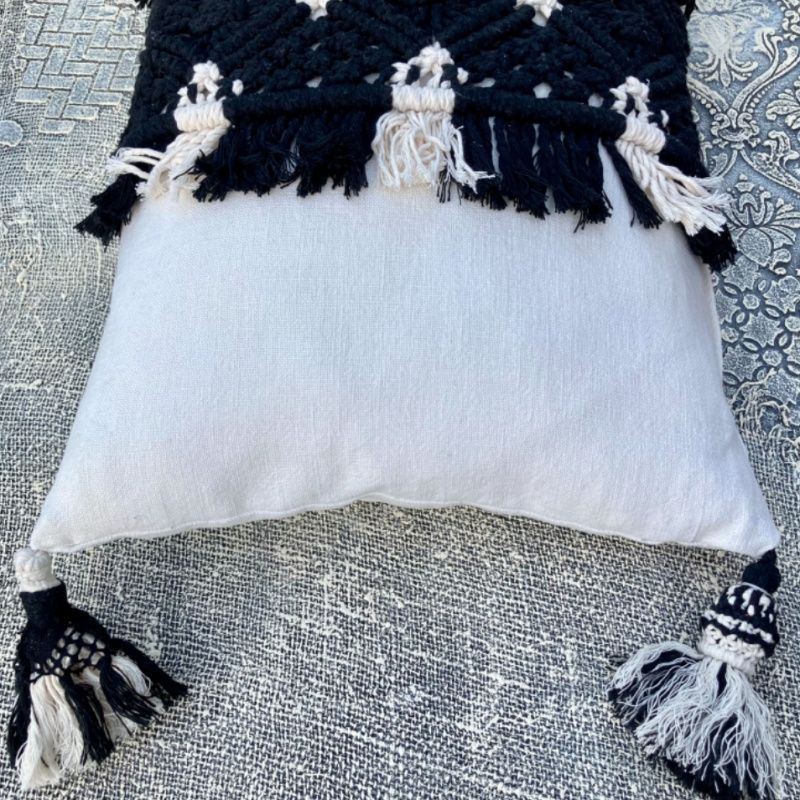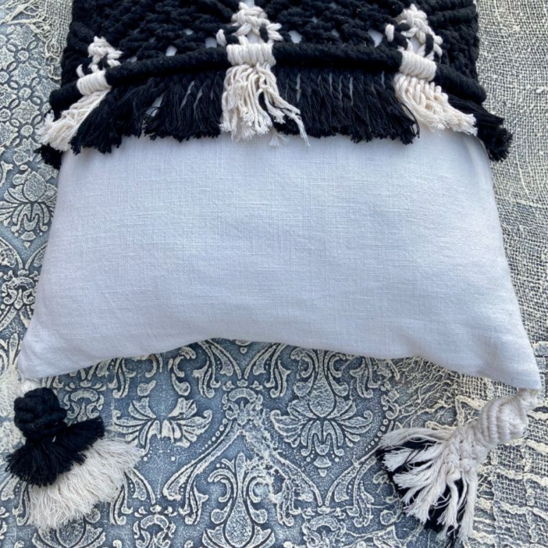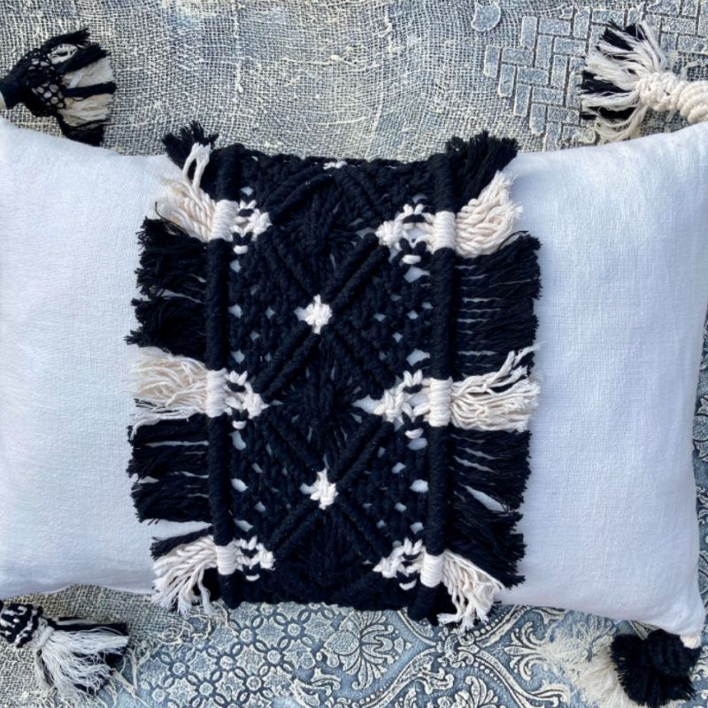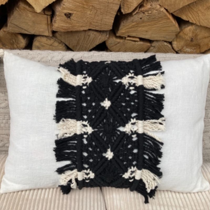 Ручная работа. Размер 58 см*39 см. На молнии. Материалы: лен, нить для макраме Macrame Rope, молния, антиаллергенный холофайбер. Декоративная подушка, интерьерная подушка из плотного льна с плетением макраме. Декорированная четырьмя кистями макраме. Верхний чехол на молнии. Внутри плотное наполнение антиаллергенным холофайбером.