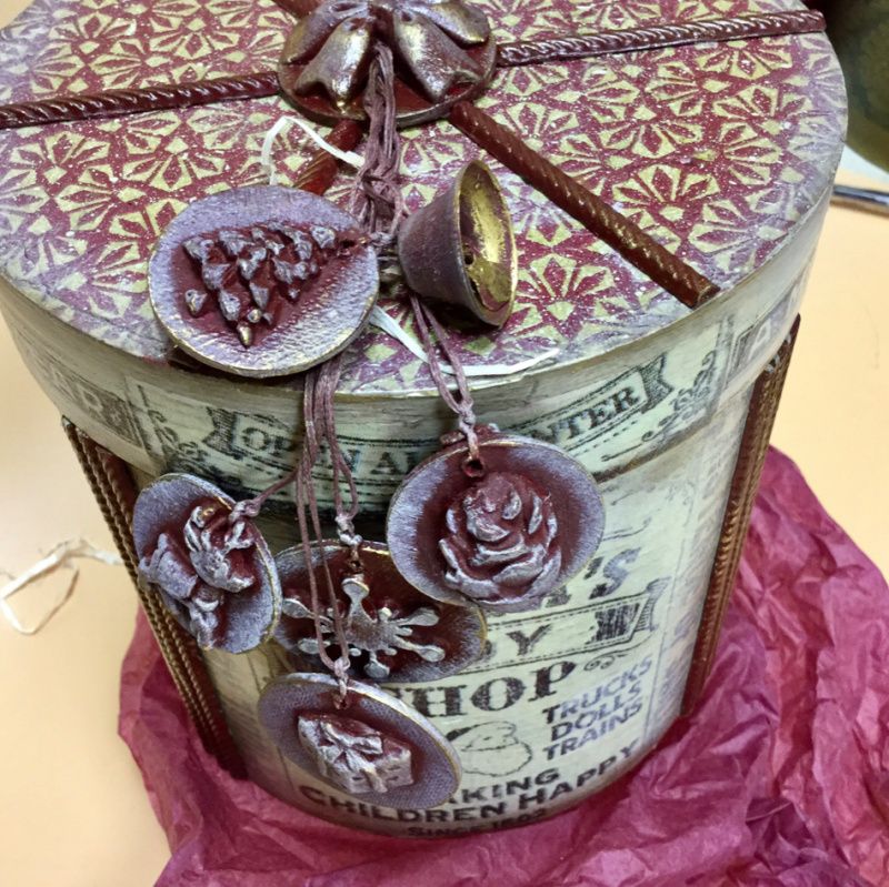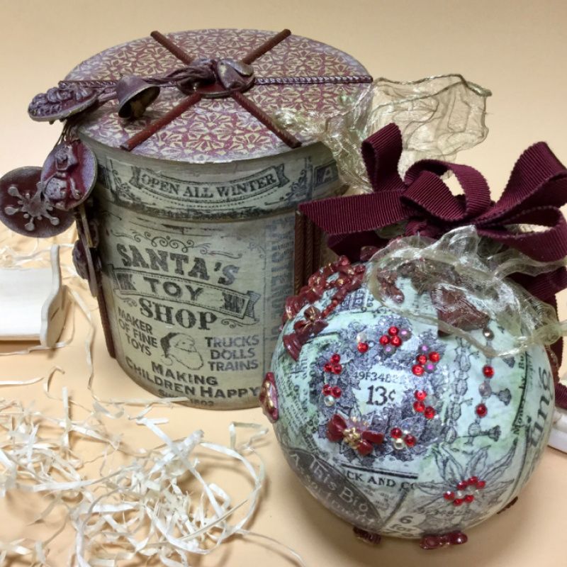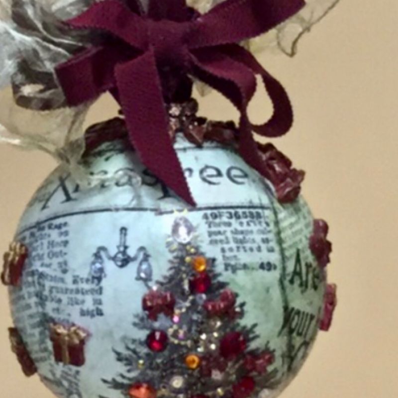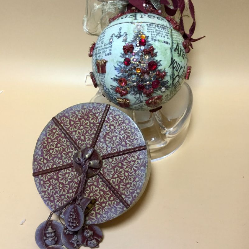 Ручная работа. Новогодний, Рождественский шар большой в подарочном коробе. Новогодний, Рождественский подарок. Инкрустация оригинальными Swarovski. Материалы: пластиковая заготовка, рисовая бумага, гибкие отливки, фурнитура, краски, воск, лента, металлизированная ткань Размер: диаметр шара 12 см