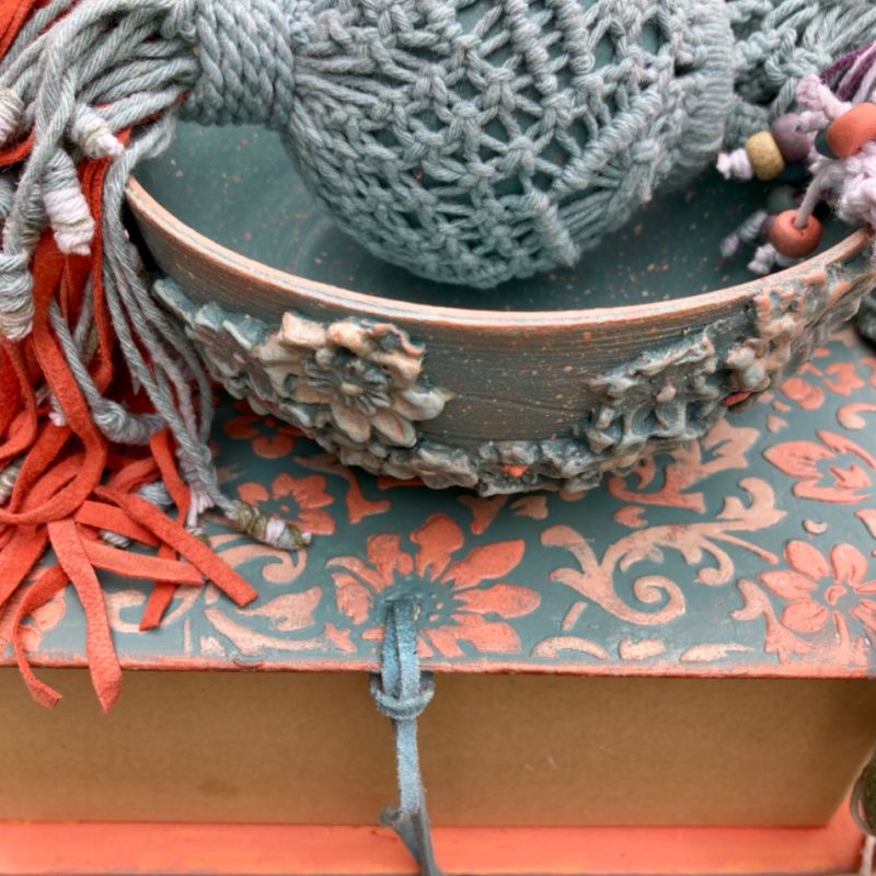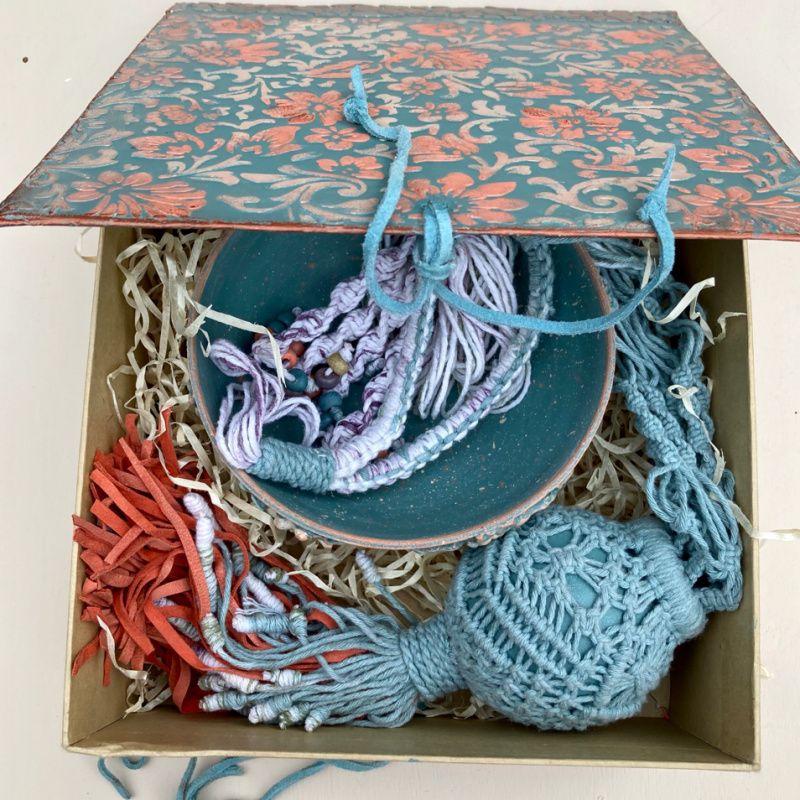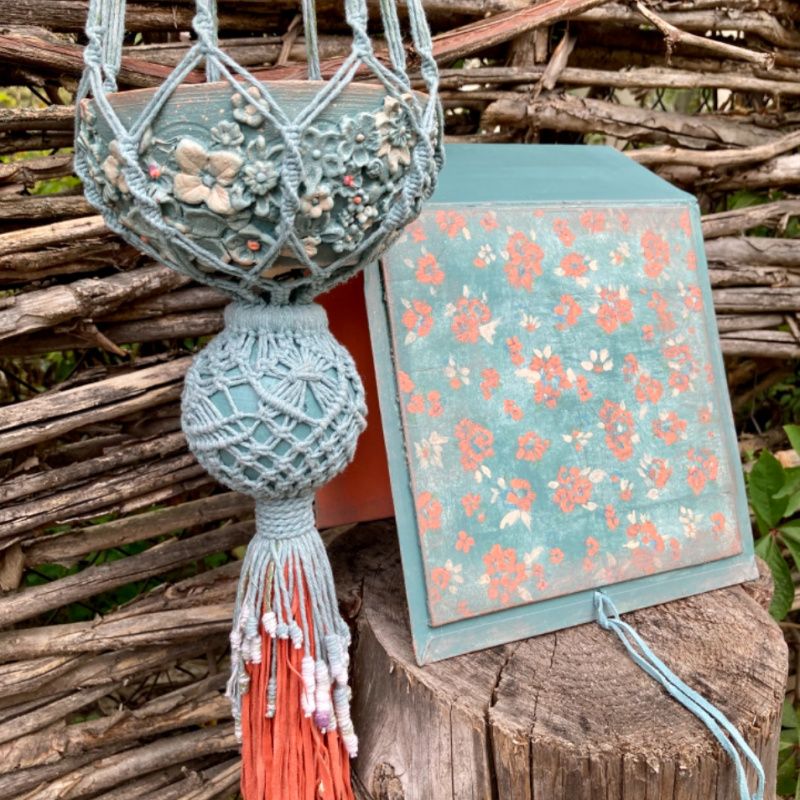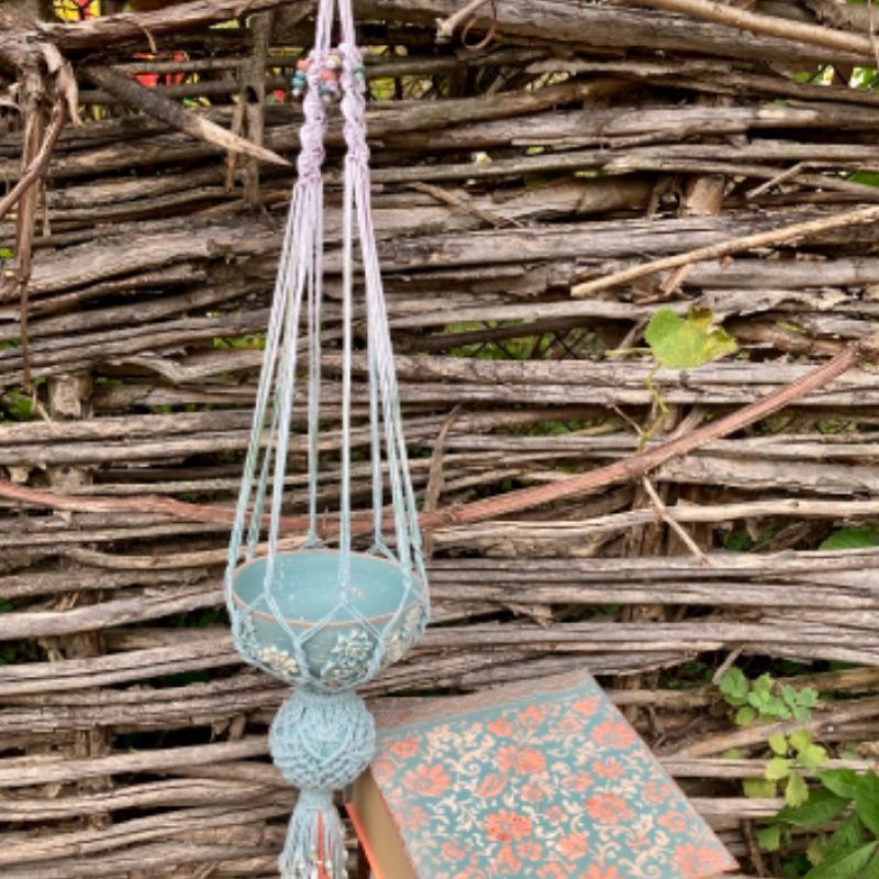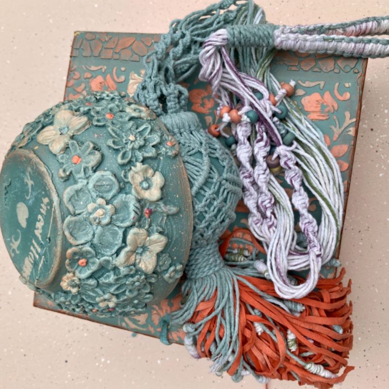 Ручная работа. Керамический вазон с лепкой и росписью в подвесном кашпо макраме с большой декоративной кисточкой из замши и шнура. Шнур с переходом цвета, окрашенный вручную. Упакован в коробку, специально изготовленную для этого набора. Оригинальный подарок для мамы, подарок для девушки, подарок для подруги. Длина кашпо с кистью 93 см. Длина кисти 17 см. Размеры вазона 13,5 * 7, высота вазона 6 см.