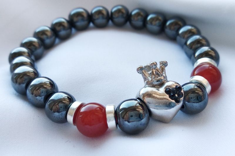 Браслет из гематита в сочетании с красным агатом. Вставка - сердце с короной, украшенное черными камнями.