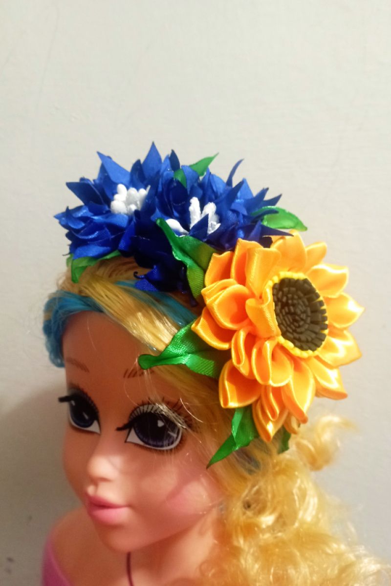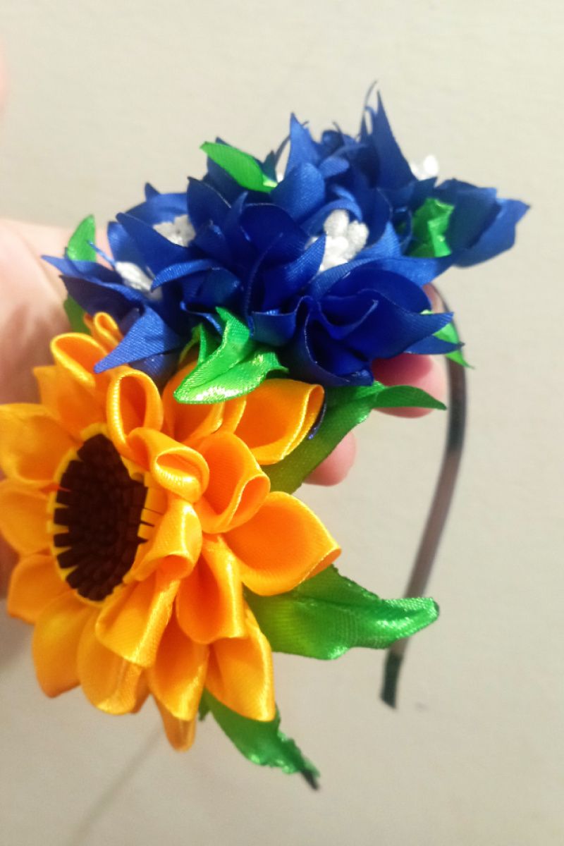 Патриотический украинский ободок с подсолнухом и васильками из атласной ленты, ручной работы, на тонком металическом ободке, подойдёт для детей от 3 лет и на взрослых.
