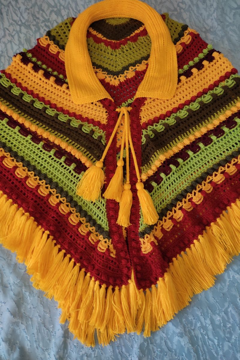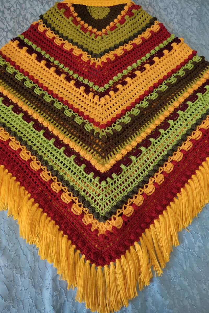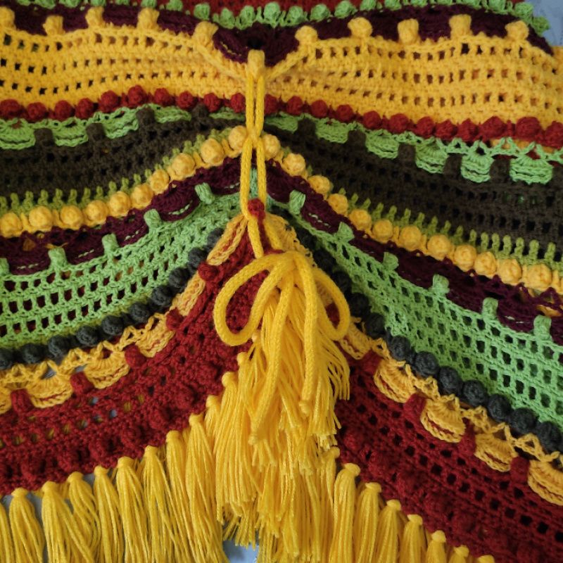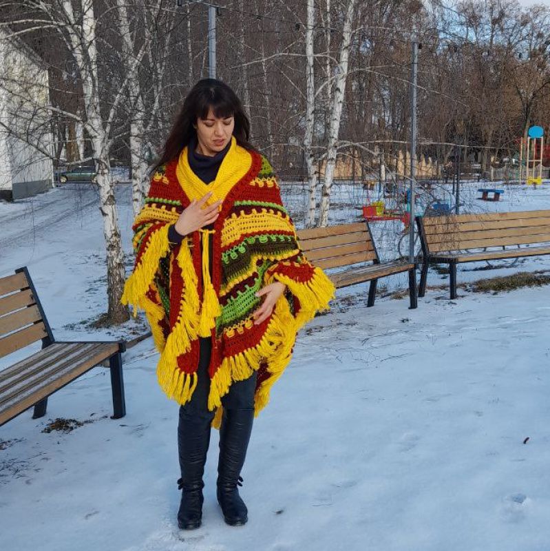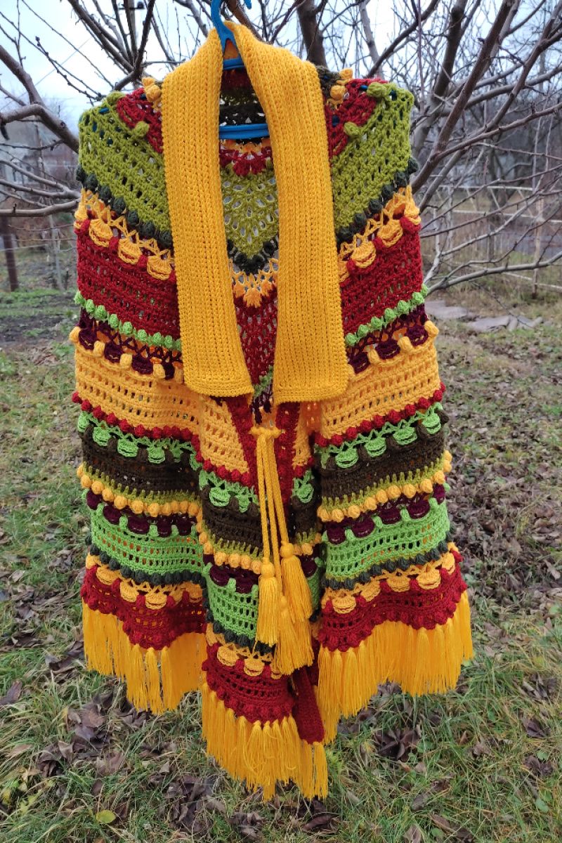 Связана крючком из шерсти,полушерсти и акрила. Очень большая(226/122см.без кистей). Тяжелая,(1,240кг). Толстая,связана обьемным узором и шишечками. Спереди завязывается на шнурах. По линии рукава можно присобрать шнуром,чтобы было удобнее что- то делать. Благодаря большому размеру,накидкой можно хорошо укутаться,как пледом. Особенно хорошо смотрится на высоких