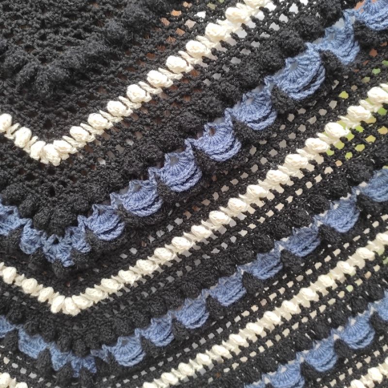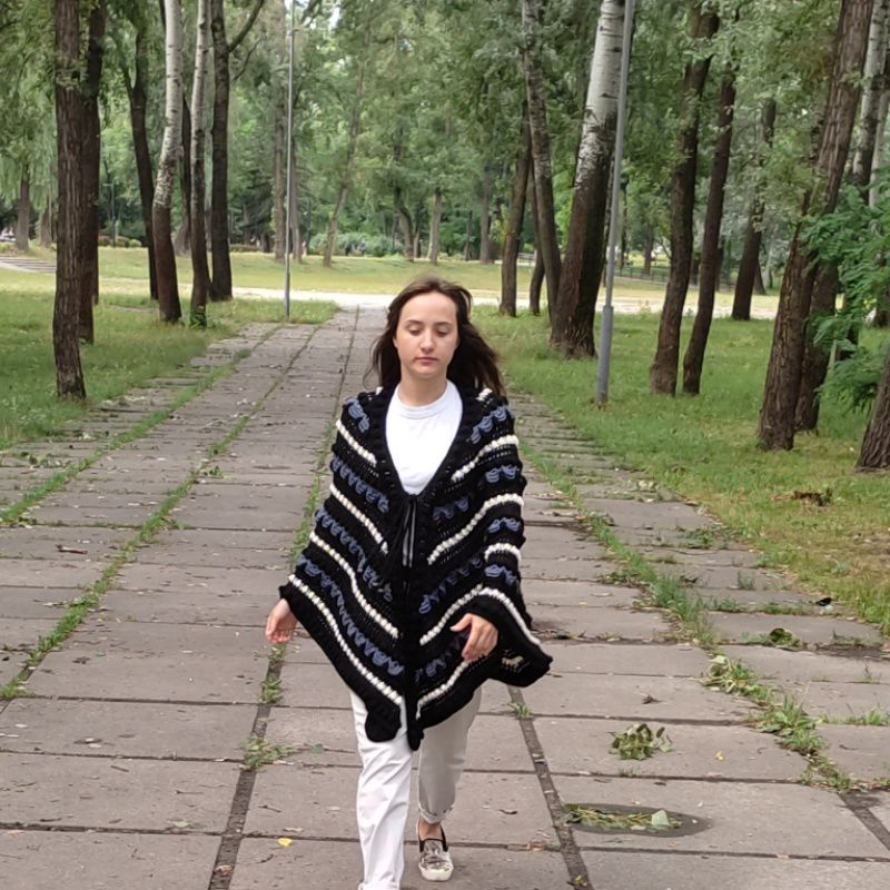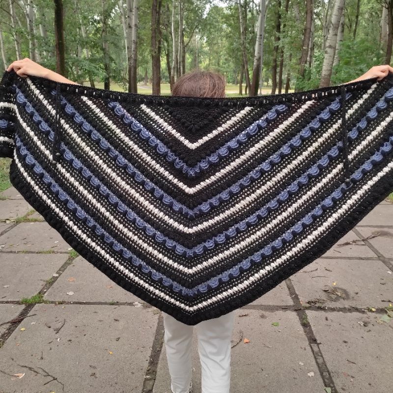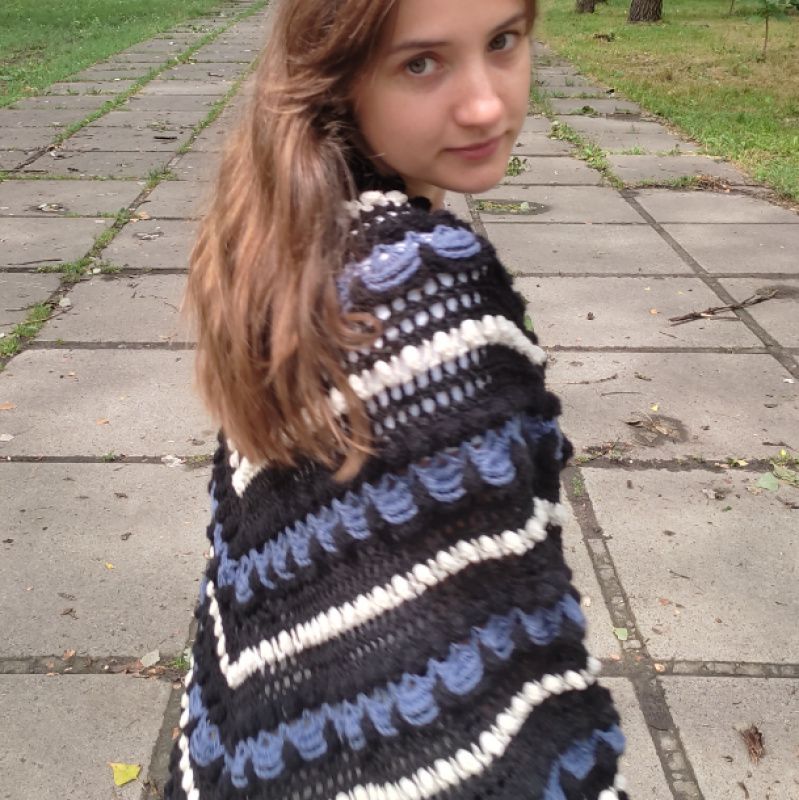 Для крупненьких дам. Накидка связана крючком объемными "плюшевый шишечками" и объемными "волнами". Черные шишки выглядят плюшевыми, потому связаны из пряжи "букле". Цвета: черный, кремовый, серо-синий. Спереди завязывается на шнуры с деревянными бусинами. Это позволяет иметь свободные руки. Шнуры легко снимаются и их можно переместить выше или ниже. Очень теплая и мягкая, но не легкая, весит 770гр. Благодаря большим размерам (227 / 110см.), Накидкой можно укутаться, как пледом и чувствовать себя комфортно в прохладные дни. Такой эксклюзивный аксессуар прекрасно дополнит Ваш гардероб в любое время года. Или сделайте подарок любимой женщине!