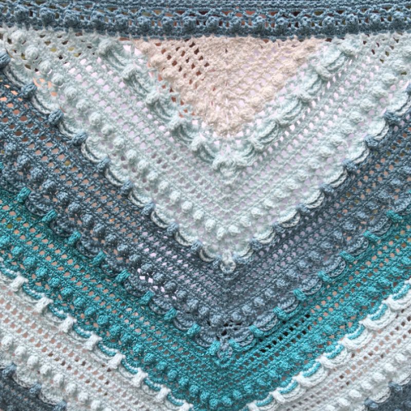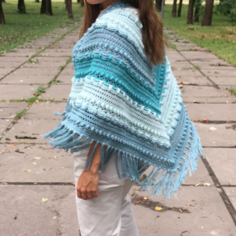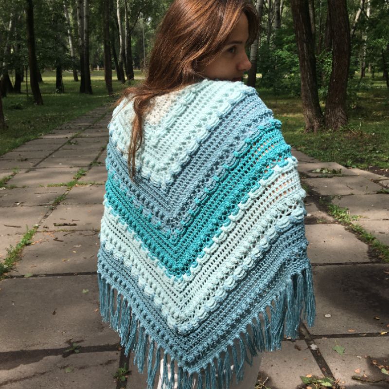 Шаль связана крючком из акриловой пряжи с добавлением голубого люрекса.