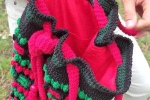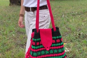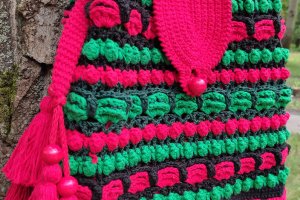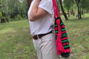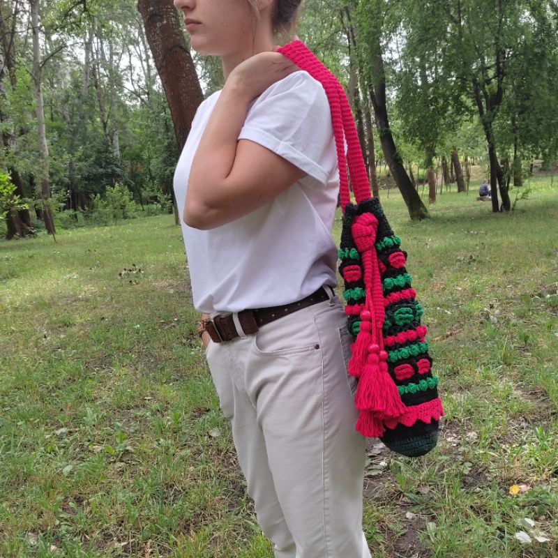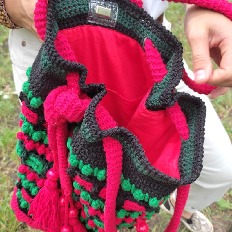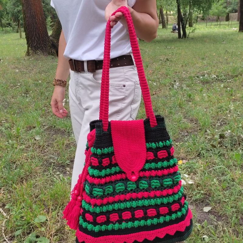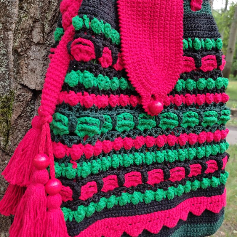Сумка зв'язана гачком з акрилових ниток,рельєфним різнокольоровим візерунком. Прикрашена клапаном,який застібується на дерев'яну бусину,китицями з дерев'яниними бусинами на краях ручки,та в'язаним мереживом по низу сумки. Довжина ручки регулюється. Підкладка пошита з бавовни і має два кармани. Сумка добре тримає форму завдяки флізеліну,вшитому в підкладку. Застібається на магнітну кнопку. Такий аксесуар буде чудовим доповненням до Вашого гардеробу в любу пору року,особливо,якщо Ви прихильниця етностилю!