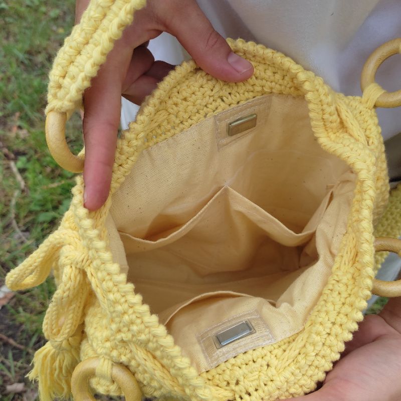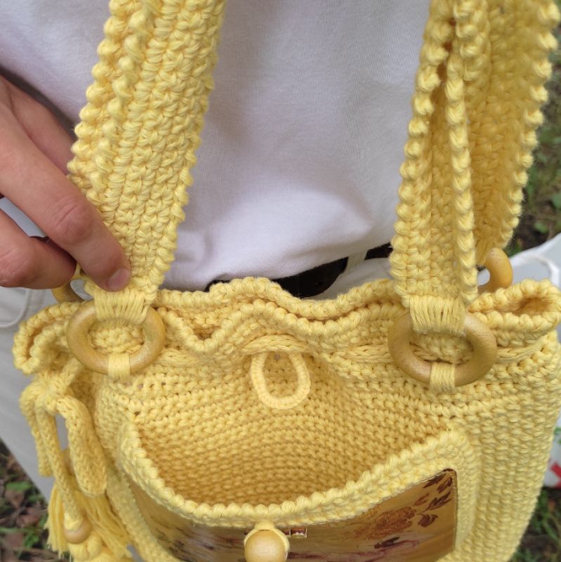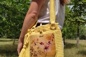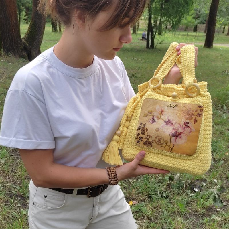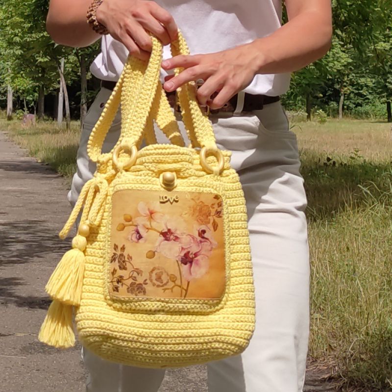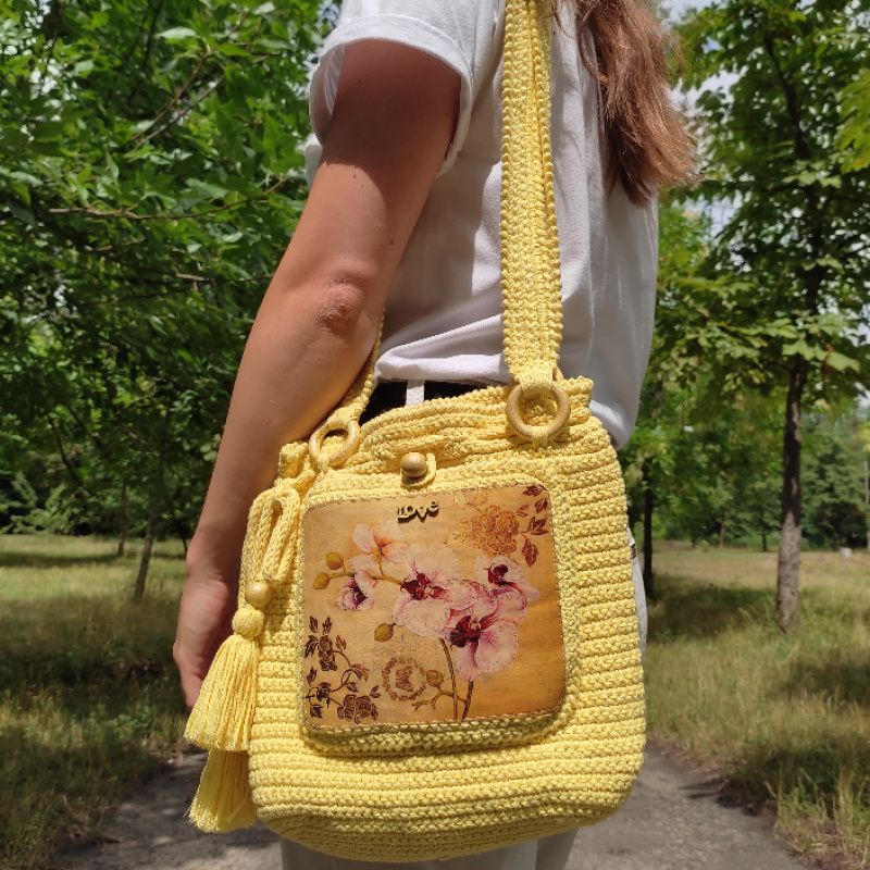 Сумочка связана крючком. Украшена деревянными окрашенными бусинами и кольцами. Впереди вязаный карман, украшенный непромокаемой картинкой с орхидеей. Подкладка сшита из хлопка и имеет два кармана. Подкладка продублирована плотным флизелином, что помогает изделию держать форму. Сумка застегивается на магнитную кнопку и ее можно затянуть вязаным шнуром, который украшен кистями. Передний карман застегивается на деревянную бусину. Такая сумочка будет только у Вас и украсит Ваш гардероб. Сделайте себе приятный летний подарок!