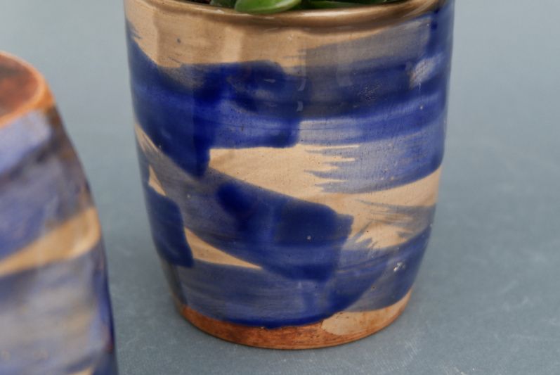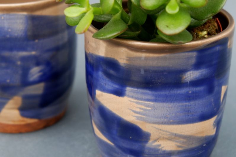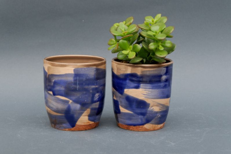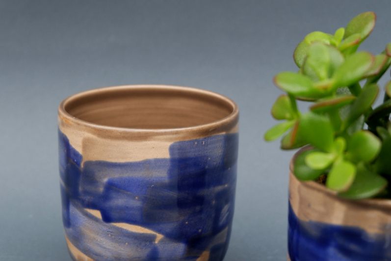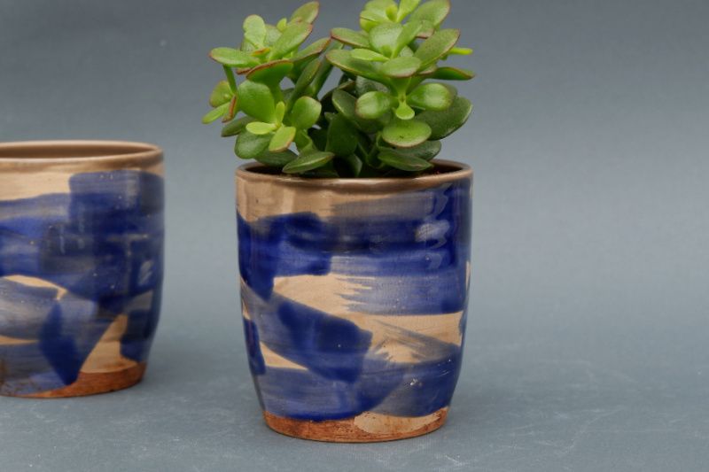 Керамічні горщики для ваших улюблених рослинок, наприклад кактусів, сукулентів, фіалок чи інших. Горщик створений з білої глини та покритий глянцевою кобальтово-синьою та сірою поливою, нижня частина матова, виконана в коричневому кольорі. Всі мазочки зроблені пензлем.