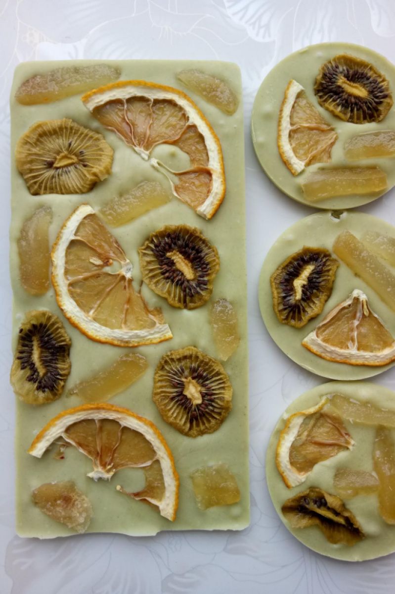 Набор из белого шоколада с цукатами имбиря, сушеными лимонами и киви