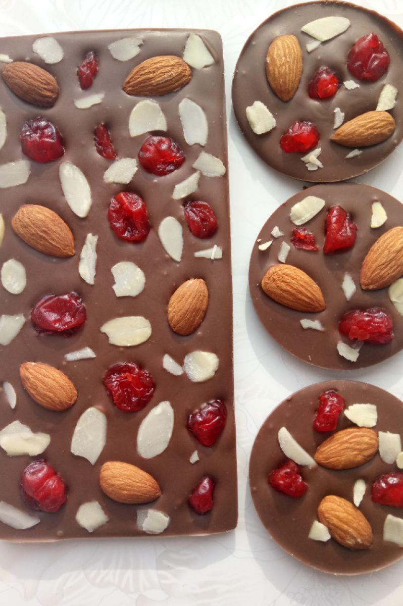 Шоколадка и 3 медиант из молочного шоколада, с сушеной вишней, целым миндалем и лепестками миндаля. Вес 150 г