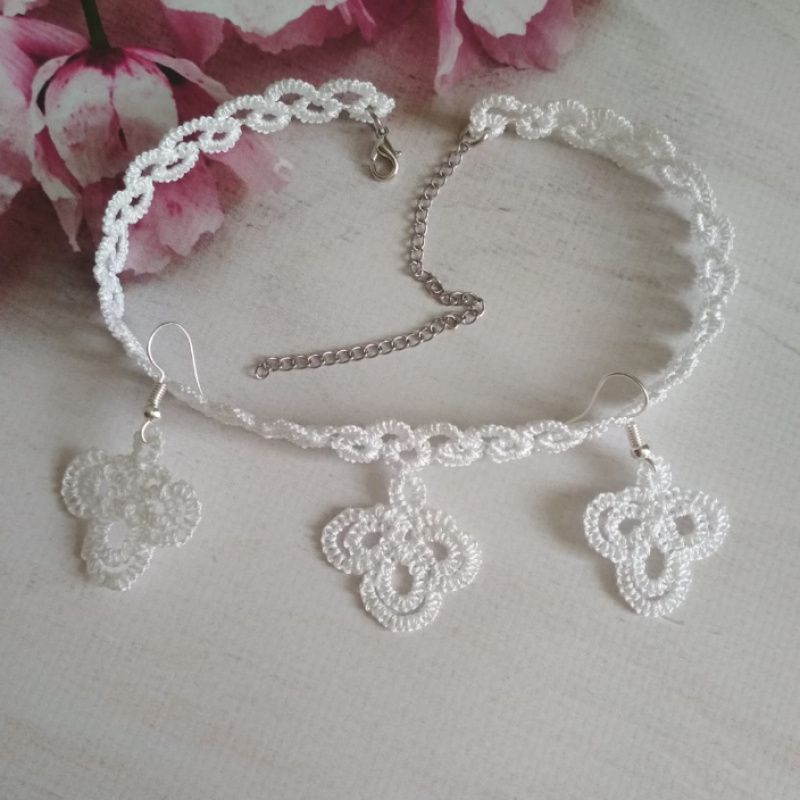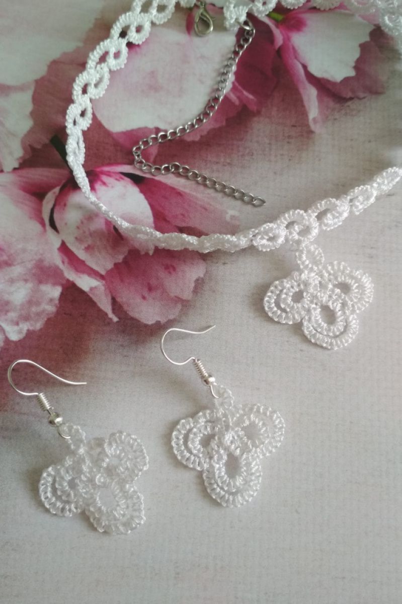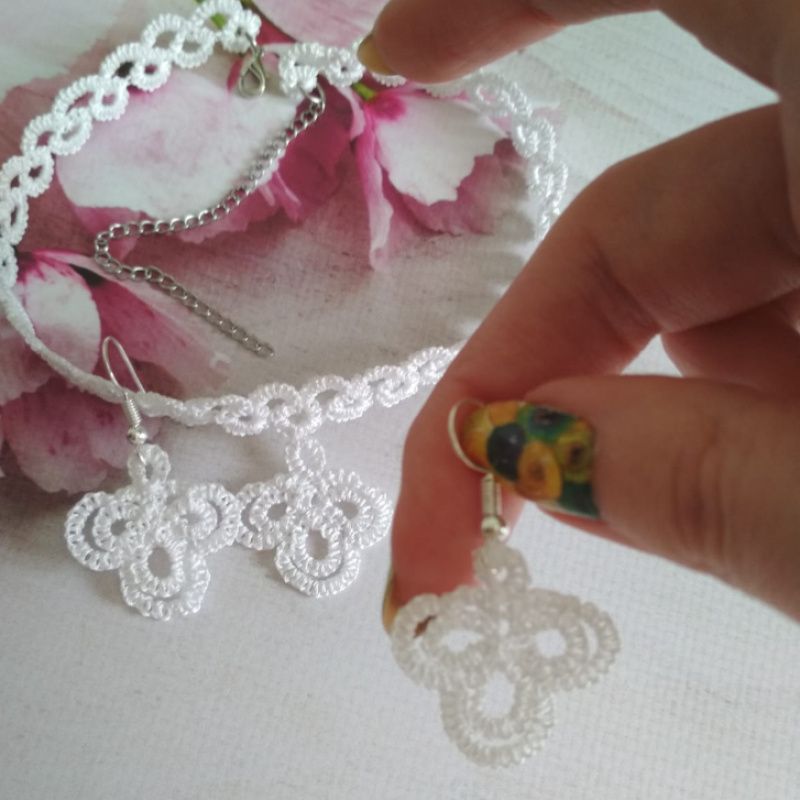 Нежный комплект украшений из сережек и чокера сделаны в технике плетения фриволите. Подарите себе уникальный подарок!
