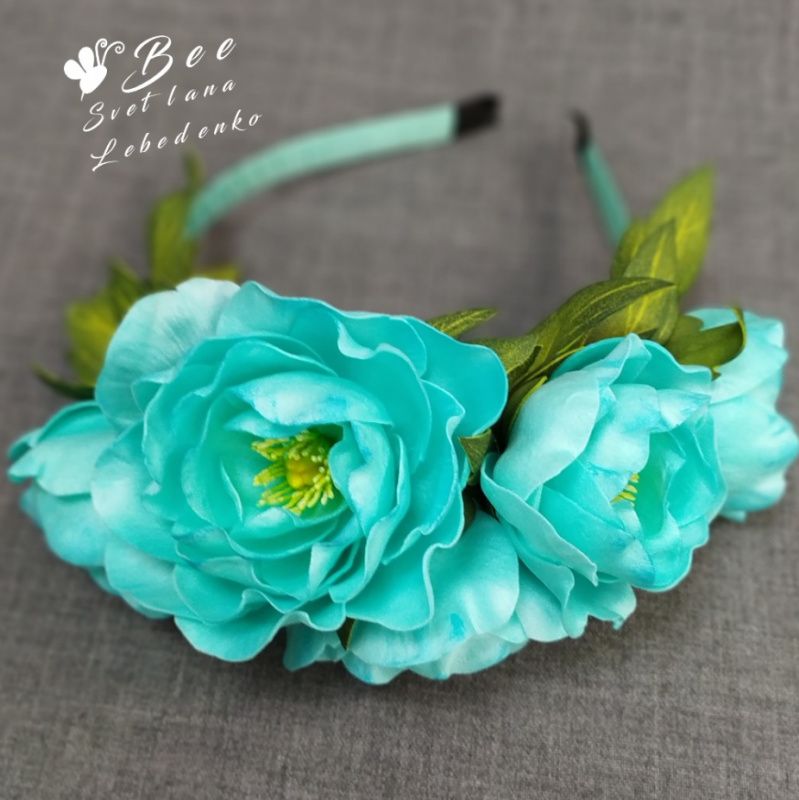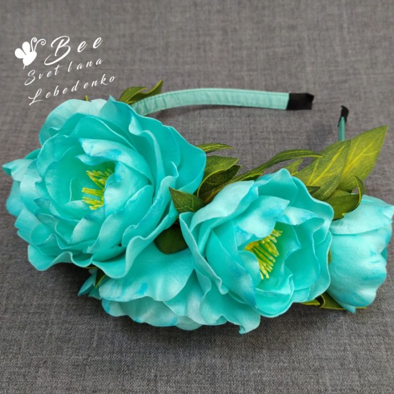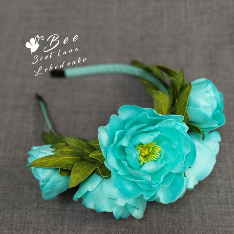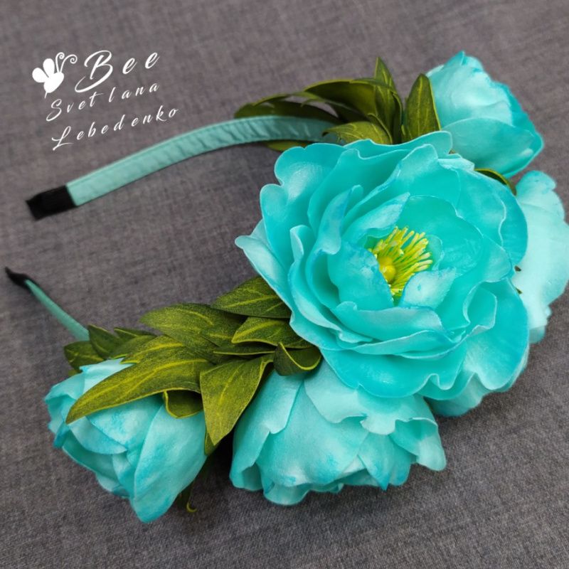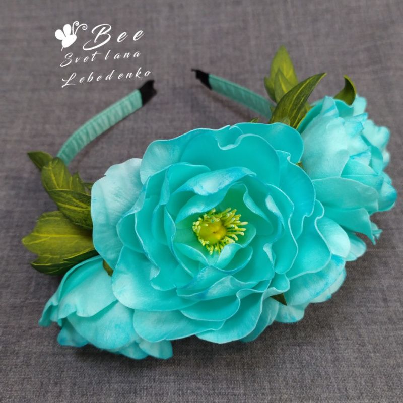 Обруч для волос с цветами из фоамирана. Цветы - пионы (5 шт.) Цветы и листья тонированы акриловыми красками. Основа обруча металлическая