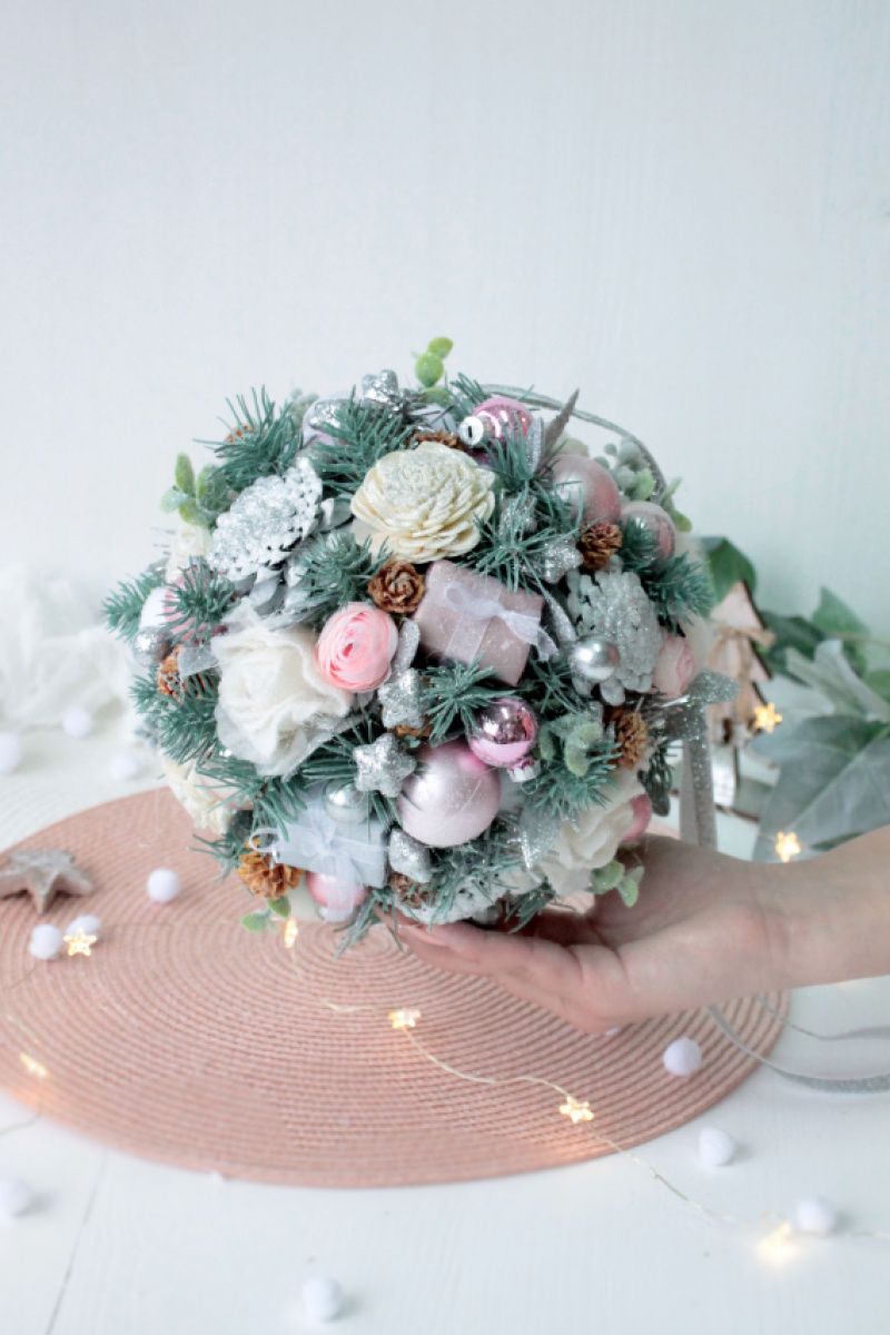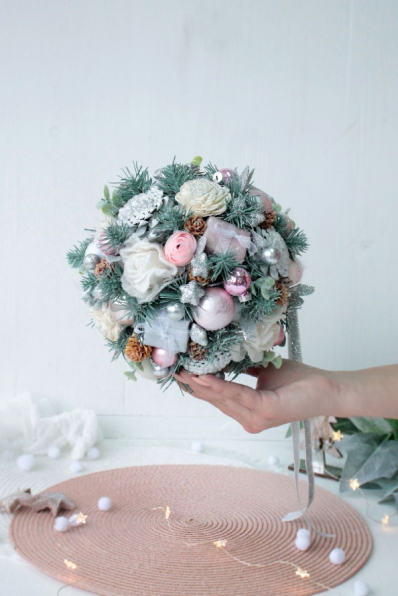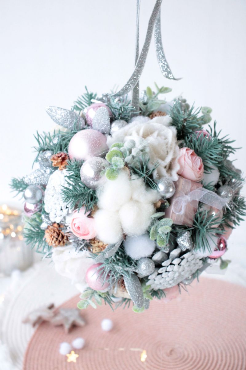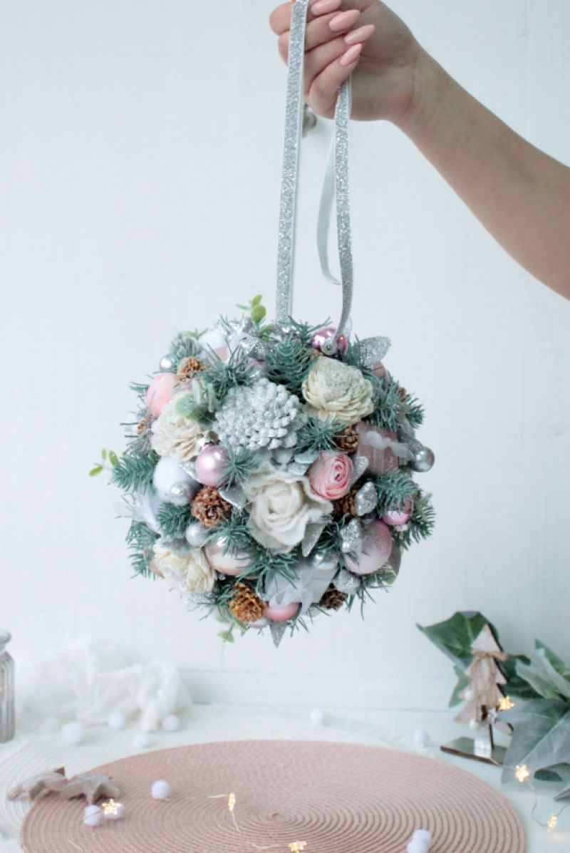 Зроблена куля з таких матеріалів;хвоя,стікляні іграшки,яблука,шишки,кульки,гілки,хлопка,квіти,зірки,подарунки,бусини.
