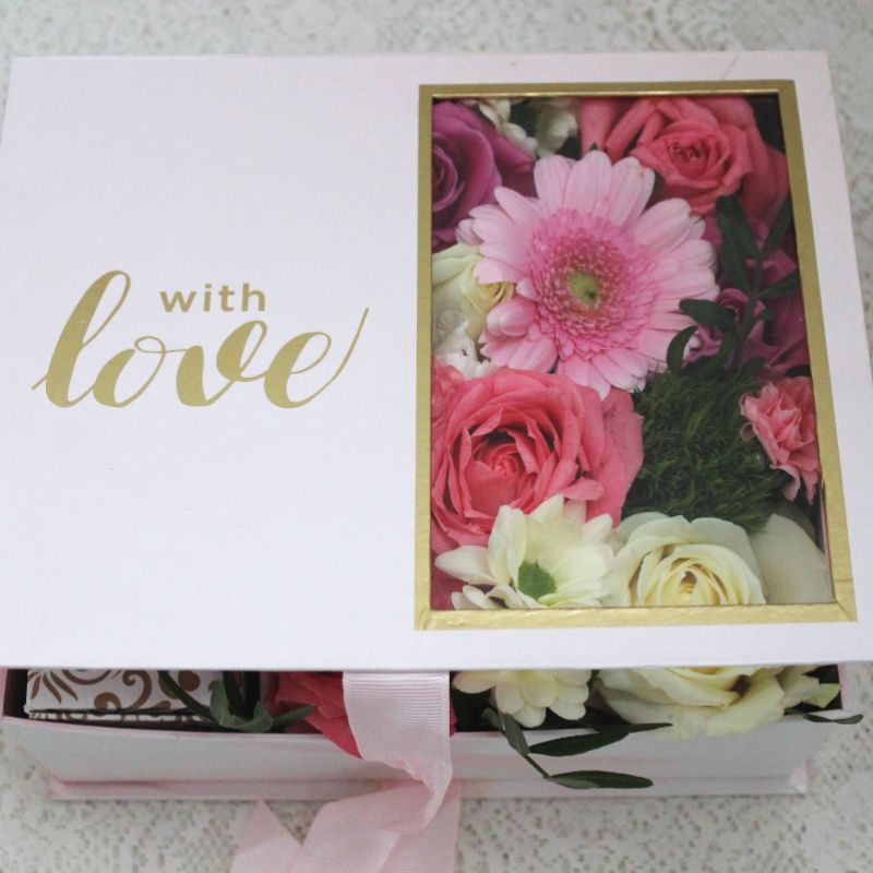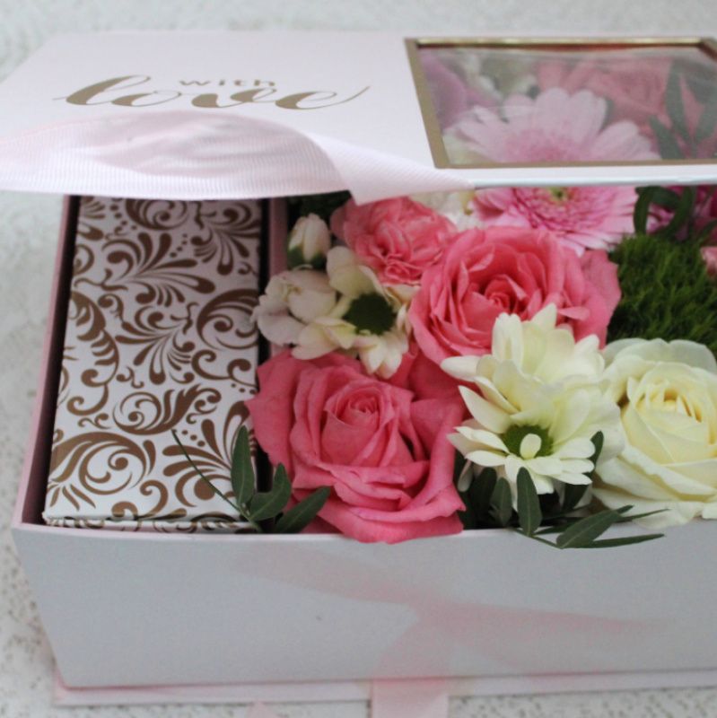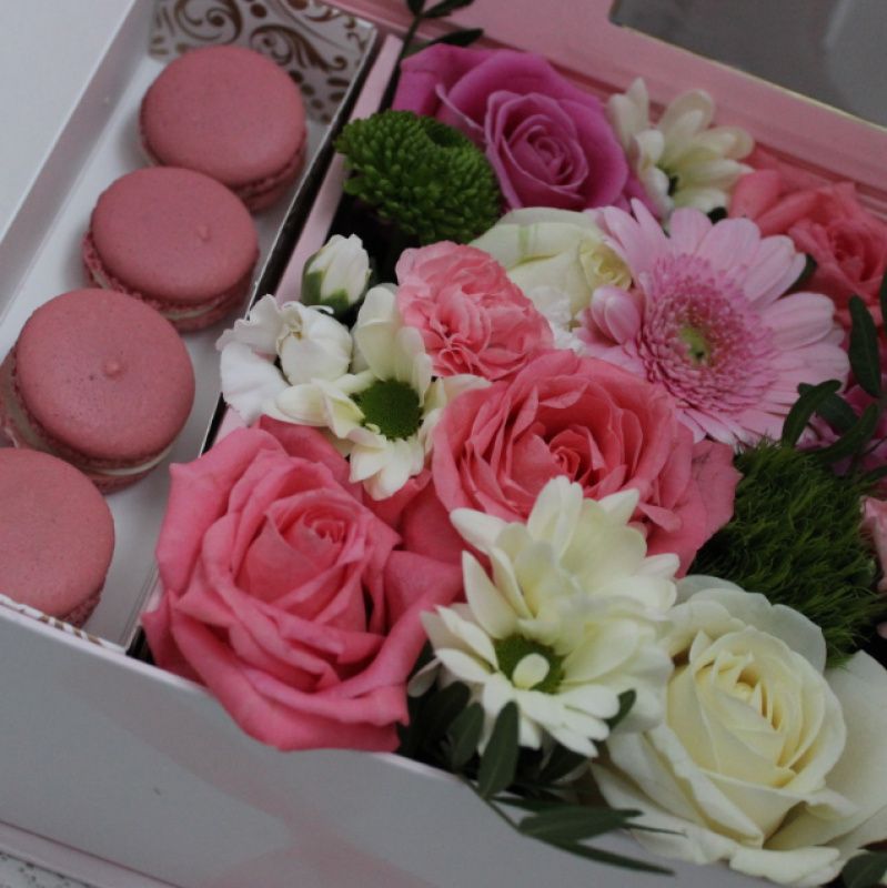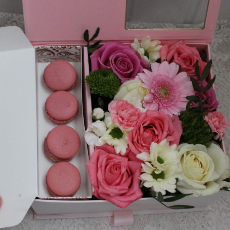 Цветочная композиция из живых цветов в коробке с прозрачным окошком.В коробке также добавлены кондитерские изделия собственного производства.Отличный подарок на праздники,Дни Рождения,подарки любимым,друзьям и т. д.