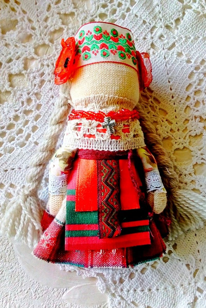Кукла оберег авторской ручной работы. Выполнена в традициях национального украинского девичьего костюма из натуральных тканей. кукла имеет жесткую форму основы, что придает ей стойкость. Высота 13-14 см.
