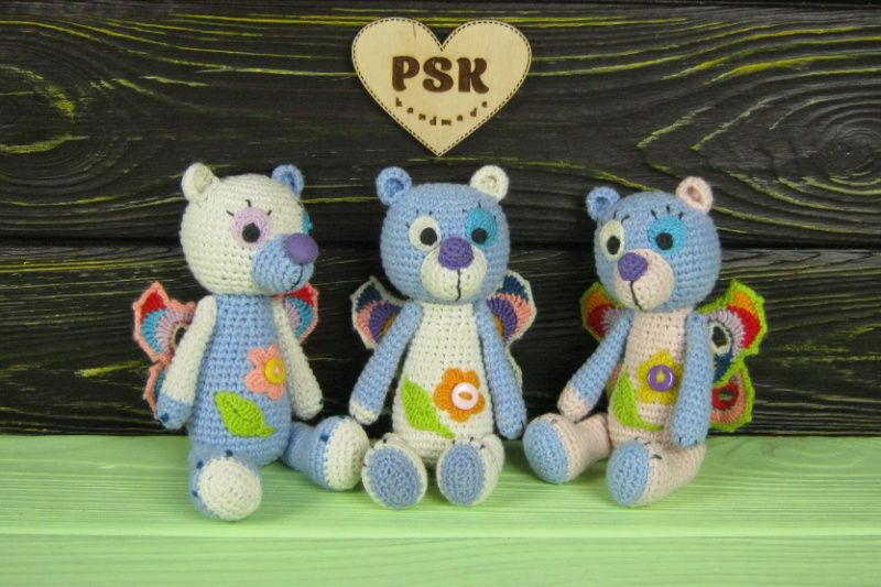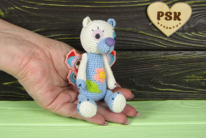Мягкий мишка с крыльями бабочки и цветком. Авторская вязаная крючком интерьерная игрушка. Прекрасный подарок взрослым и детям за цену производителя! ★ Описание: • высота сидя ~15 см, длина с ногами ~19 см, размах крыльев ~8 см, вес ~75 г; • 100% натуральная пряжа, хлопок и лен (тело); • стойкая акриловая пряжа (крылья, глаза и аппликации); • подвижные конечности; • гипоаллергенный наполнитель холофайбер; • допустимая машинная стирка на деликатных режимах; • материалы, не подверженные линьке и выгоранию на свете; • широкие возможности персонализации за отдельную плату (вышивки инициалов, исполнение в других цветах и т.п.); • клеены только крылья, все остальное сшито вручную; • максимальное использование составляющих украинского производства; • скидки и бонусы при заказе более одного изделия и на последующие покупки (больше об этом – в частной переписке); • прочность исполнения позволяет интенсивное использование – путешествия, игры и т.д.