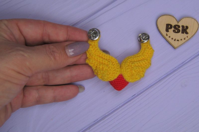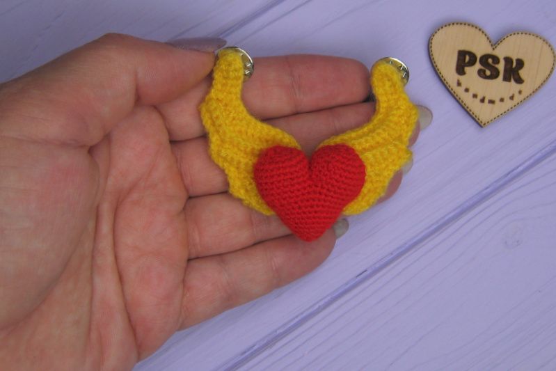 Сердце с крыльями ангела, вязаная брошка ручной работы PSK 2