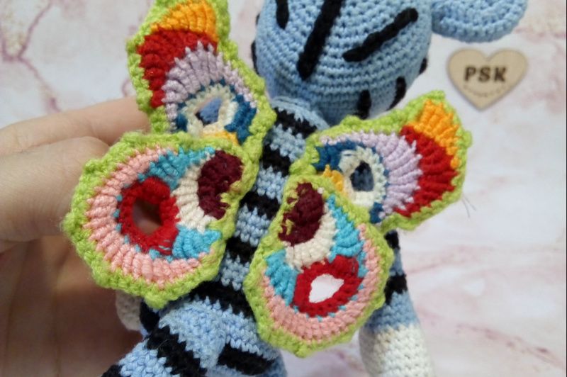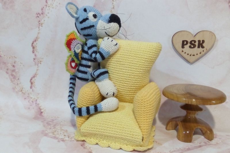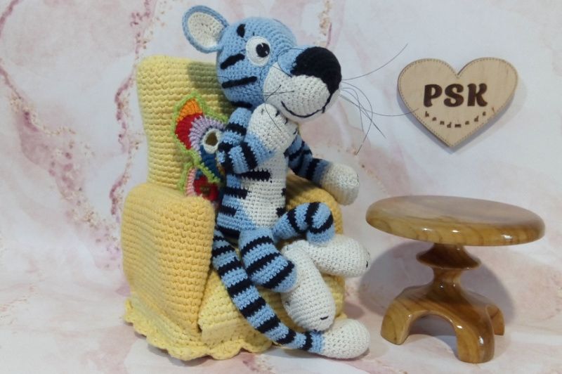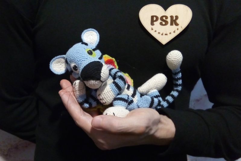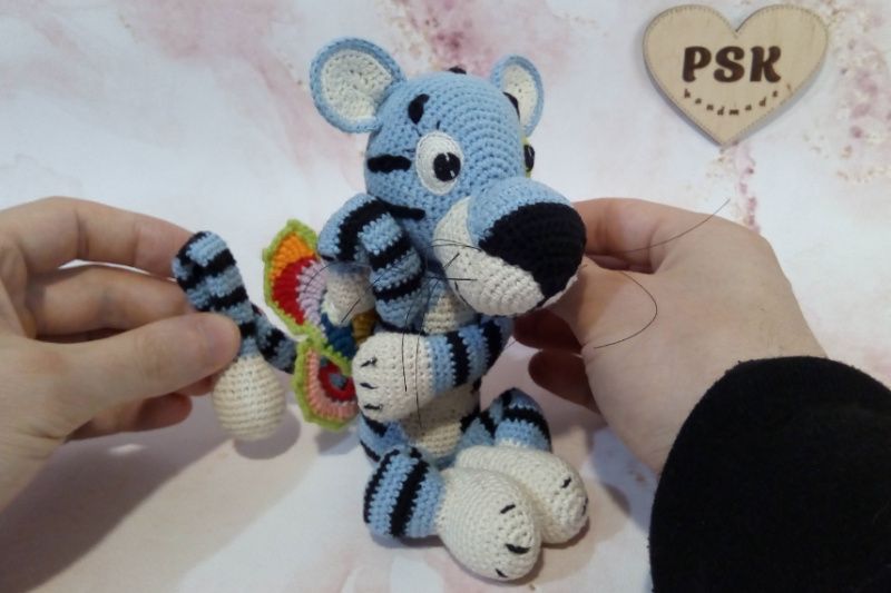 Голубой тигр с крыльями бабочки и длинным хвостом. Авторская вязаная крючком интерьерная игрушка, символ года 2022. Отличный подарок взрослым и детям по цене производителя! ★ Описание: • 100% натуральная пряжа, хлопок и лен (тело); • особенно стойкая акриловая пряжа (крылья, глаза и вышивка); • подвижные конечности; • гипоаллергенный наполнитель холлофайбер; • без клея; все сшито вручную; • допустимая стирка в стиральной машине на деликатных режимах; • материалы, не подверженные линьке и выгоранию на свете; • широкие возможности персонализации за отдельную плату (вышивка инициалов, исполнение в других цветах и прочее); • максимальное использование составляющих украинского производства; • скидки и бонусы при заказах более одного наименования и на последующие покупки (больше об этом – в личной переписке); • крепость изделия позволяет безбоязненное интенсивное использование – путешествия, игры и прочее.