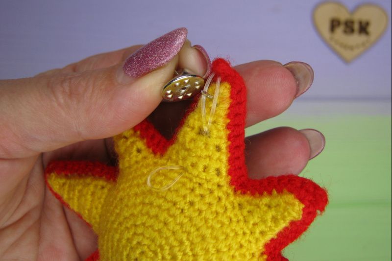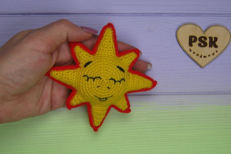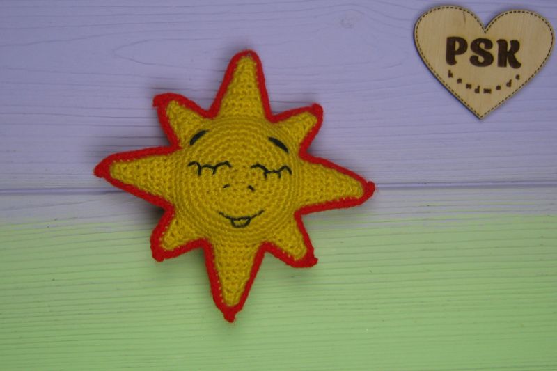 Солнце с лицом смайлик. Вязаная вышитая брошка ручной работы