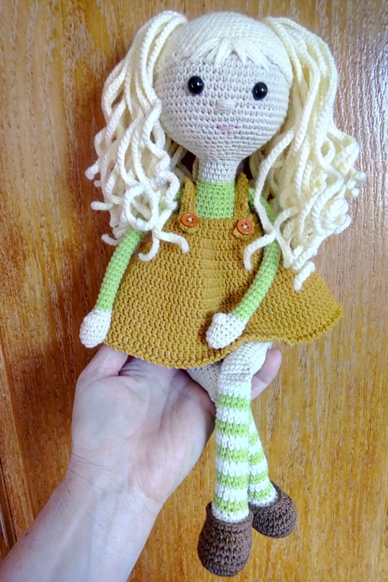 Куколка игровая, практичная в использовании. Может сидеть. Волосы надёжно прикреплены. Глазки на безопасном креплении. Одежда не снимается. Пуговки на одежде для декорации пришиты. Имеется проволочный каркас только в основании голова-туловище для надёжного крепления головы. Проволока в каркасе изолирована пластырем, края изогнуты в петлю, чтобы игрушка была безопасной для малышки. Наполнитель холлофайбер.