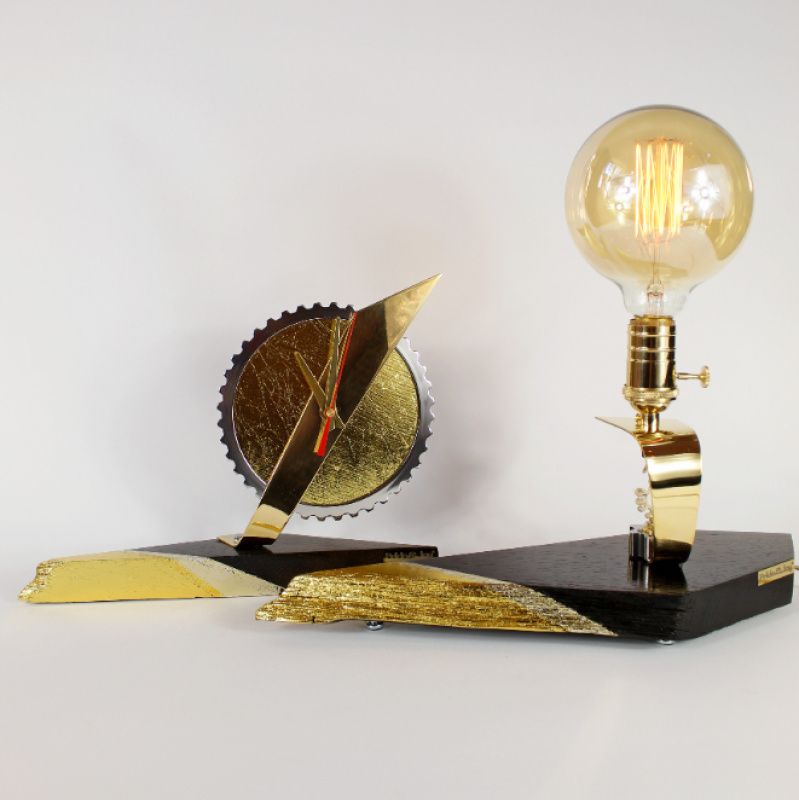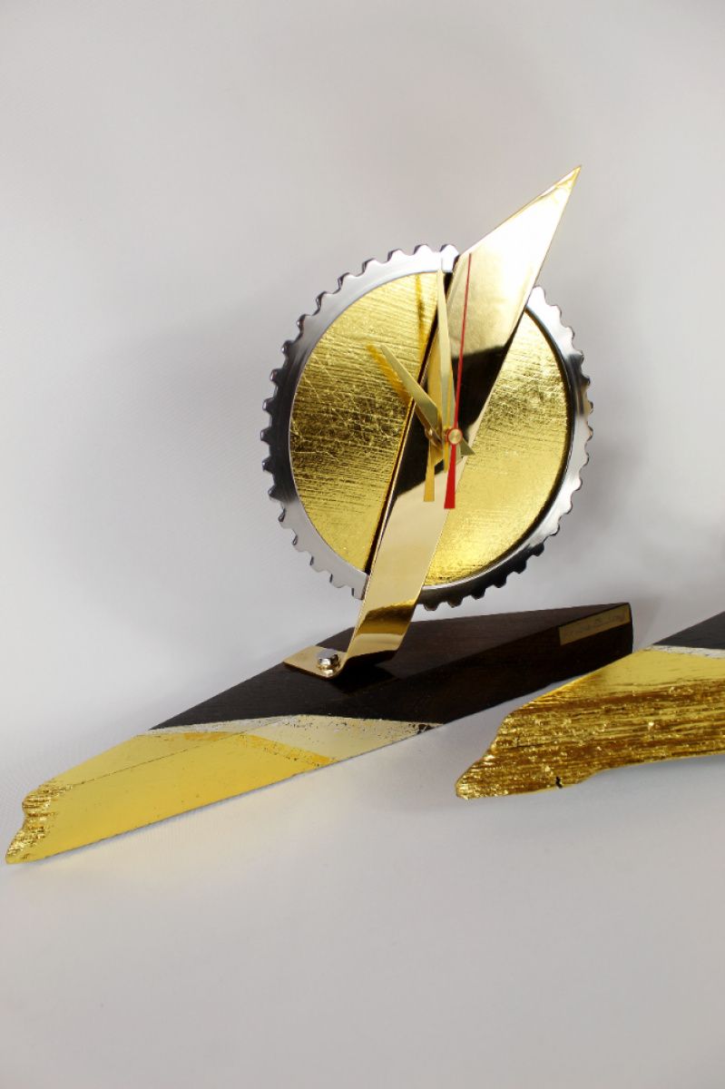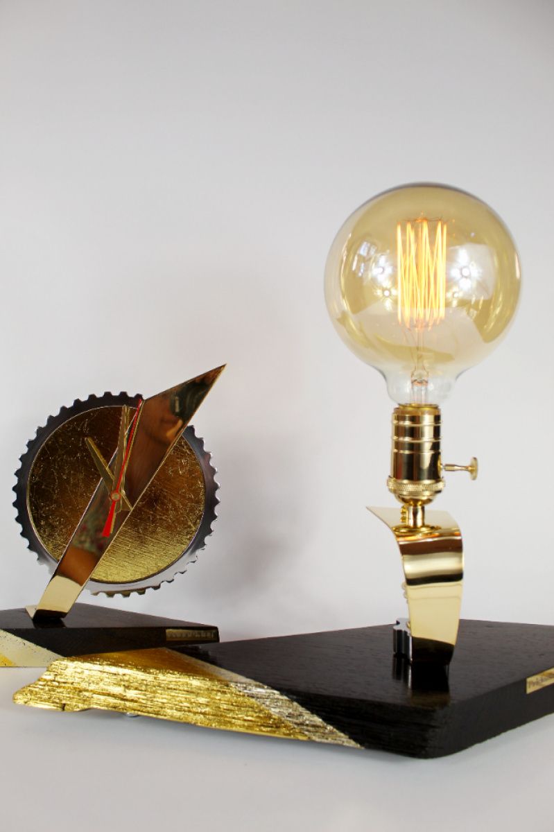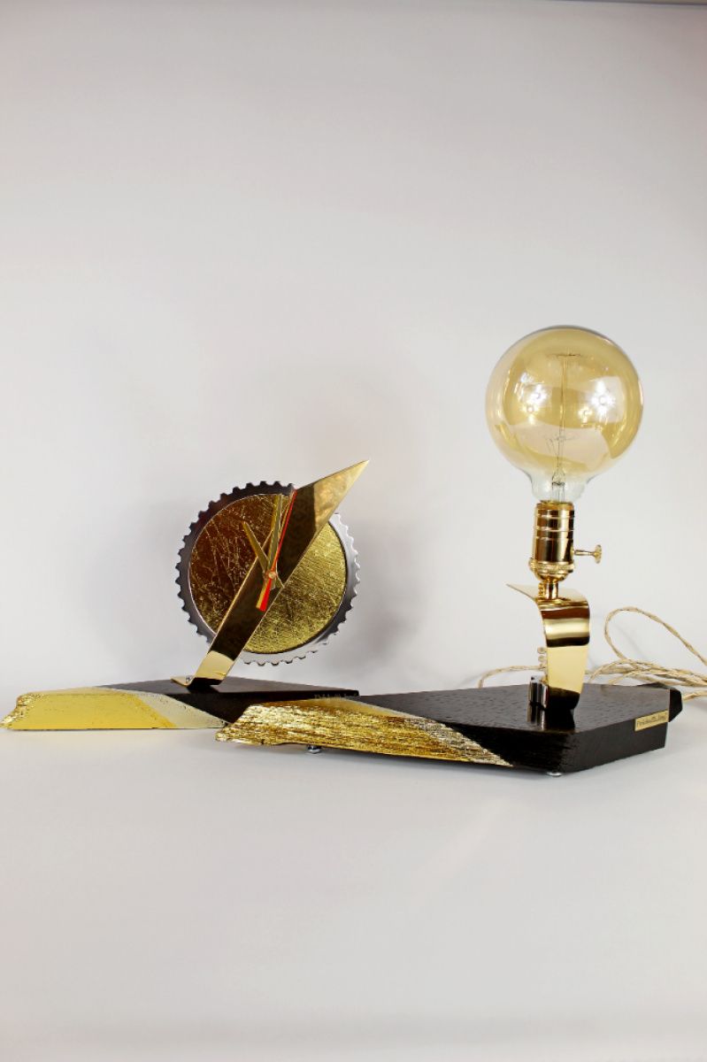 Комплект, из настольной лампы и часов Pride&Joy, изготовлен из авто-деталей, металла и натурального мореного дуба, драгоценного материала, который был создан самой природой, после того, как он прожил, свою долгую жизнь на земле, он провел сотни, а то и тысячи лет в воде, где впоследствии и приобрёл свою неповторимость. И последним штрихом данной коллекции является рисунок, выполненный, с помощью потали (имитации сусального золота и серебра). Изящные изделия, ручной работы, с индивидуальным дизайном. На лампе установлен димер для регулировки яркости света на любой вкус. Лампа: Основание (длина): 35 cm Высота: 35 cm Вес: 1 kg Часы: Основание (длина): 29 cm Высота: 22 cm Вес: 0,5 kg Battery: 1 * AA battery (не входит в комплект) Авто- деталь и дерево (текстура и форма), в каждой модели, могут отличаться от заявленных на фото Можно заказать отдельно и по желанию: 1) Гравировка (на металлической основе). Стоимость, на основе размером 3 см. на 5 см. + 300 грн. 2) Фирменная коробка из дерева (фанера) + 500 грн. 3) Мы можем добавить в эту лампу USB Port (для зарядки телефона). Стоимость +650грн. Эта коллекция была создана под индивидуальный заказ. Конечная обработка деревянной подставки может варьироваться в зависимости от каждой модели, поскольку она в значительной степени зависит от текстуры и внешнего вида деревянной детали, которую мы используем. Мы не можем гарантировать точный оттенок или текстуру дерева. Вы можете рассматривать этот комплект, как пример, для аналогичных проектов и мы создадим что-то похожее и для Вас.