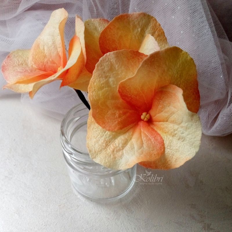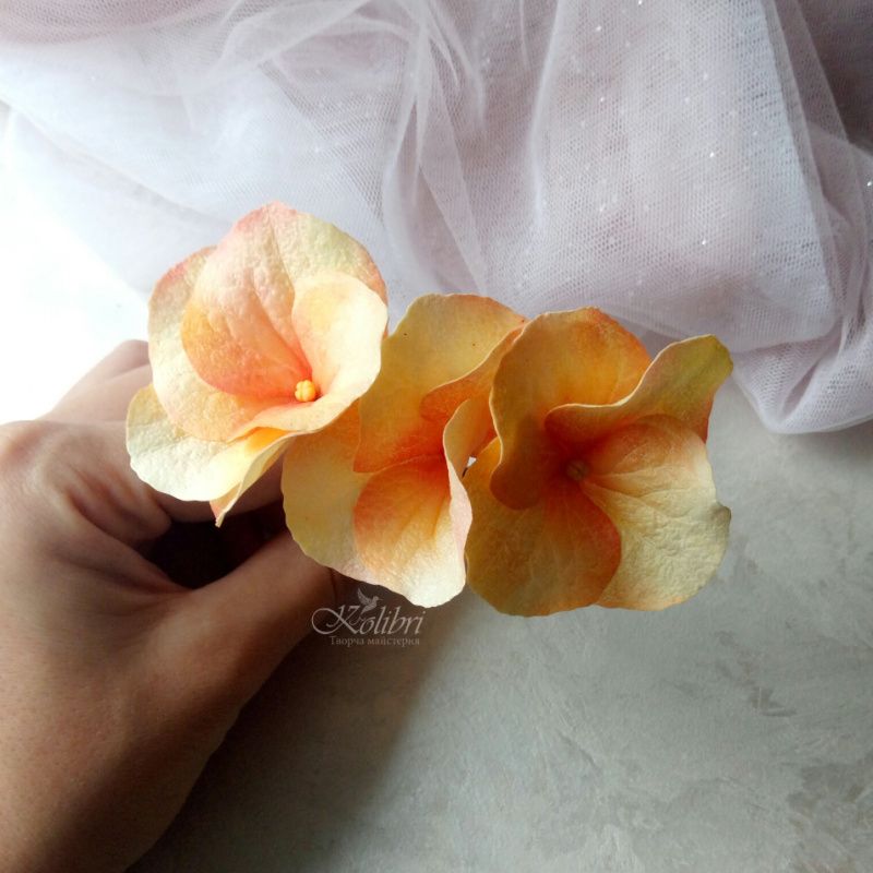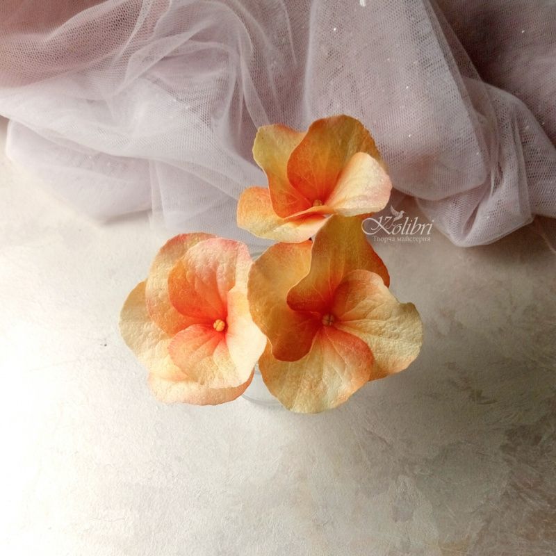 Цветы гортензии яркой расцветки идеальны для осенней фотосессии. Цветы закреплены на шпильки, но возможно закрепить на любую основу (шпильки, ободок, брошь, гребень, невидимки) Диаметр цветка 4.5 см Возможно изготовление в любом количестве и цвете. Отправка сразу после оплаты.